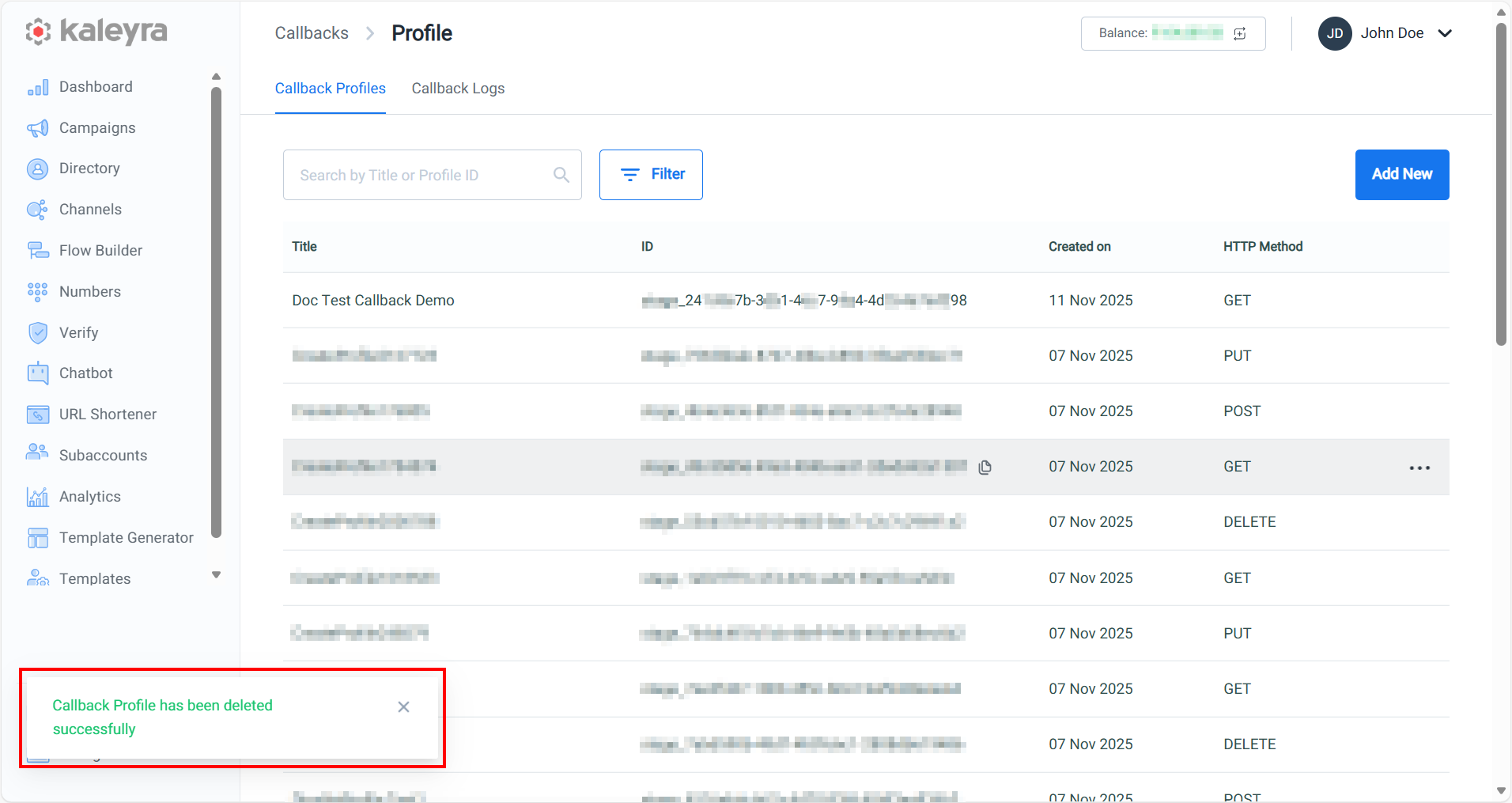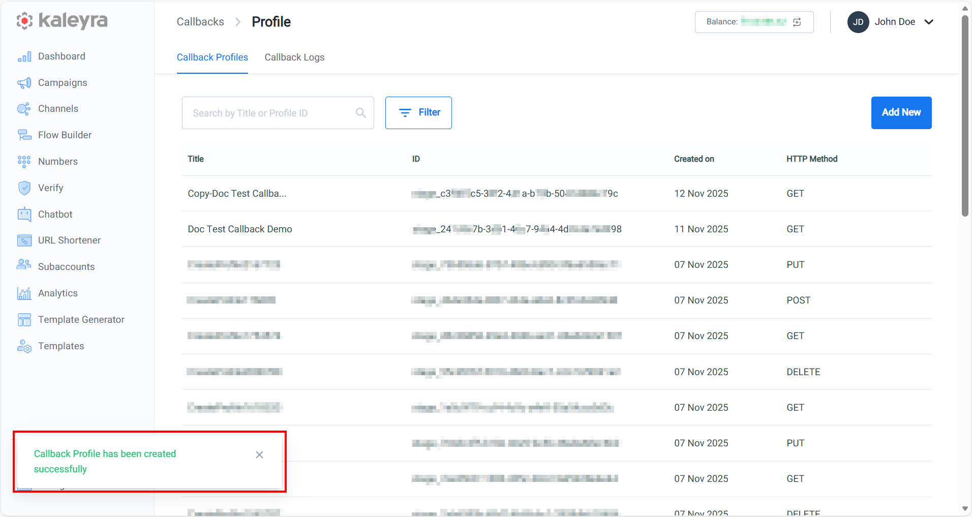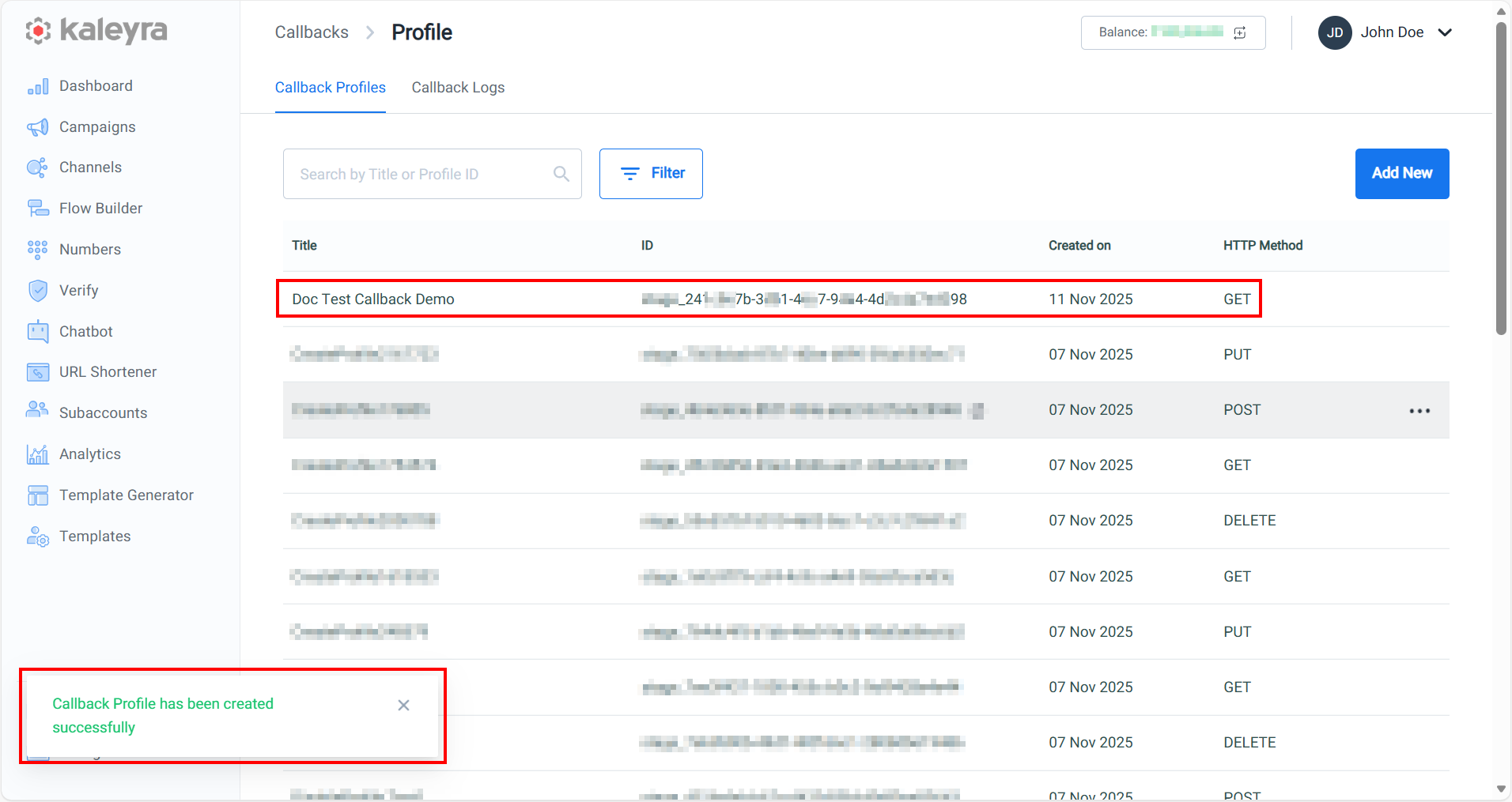 - Click Save to save the callback profile in your kaleyra.io account. The confirmation message Callback Profile has been created successfully appears.