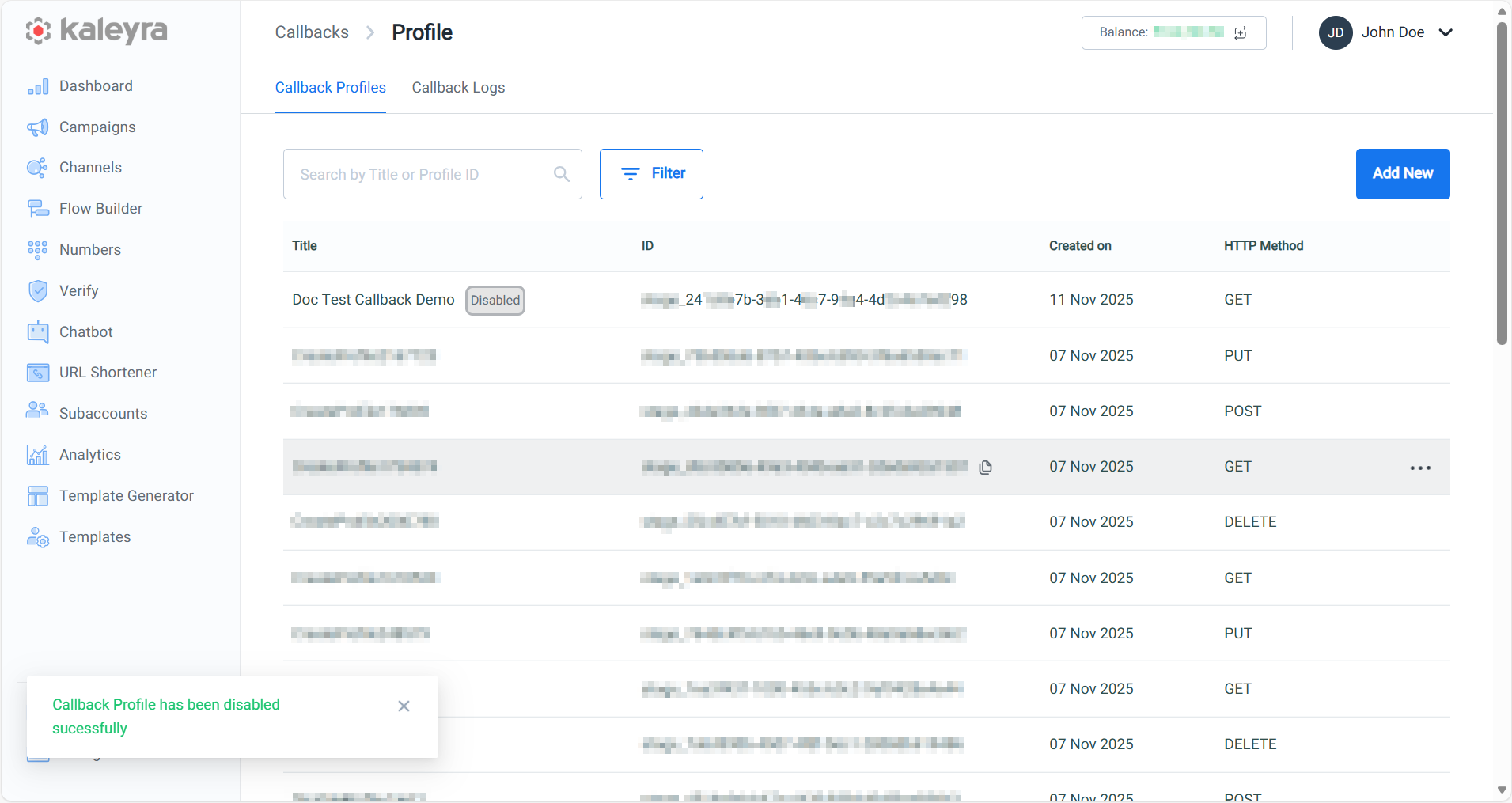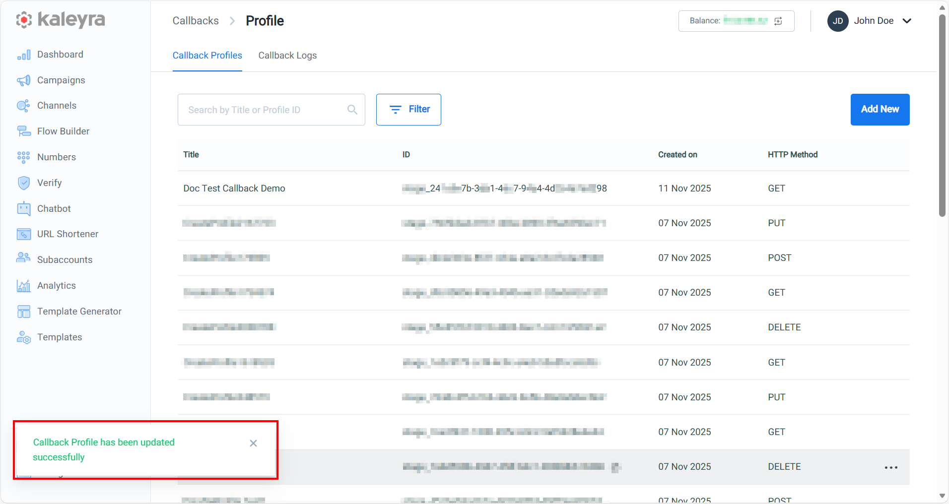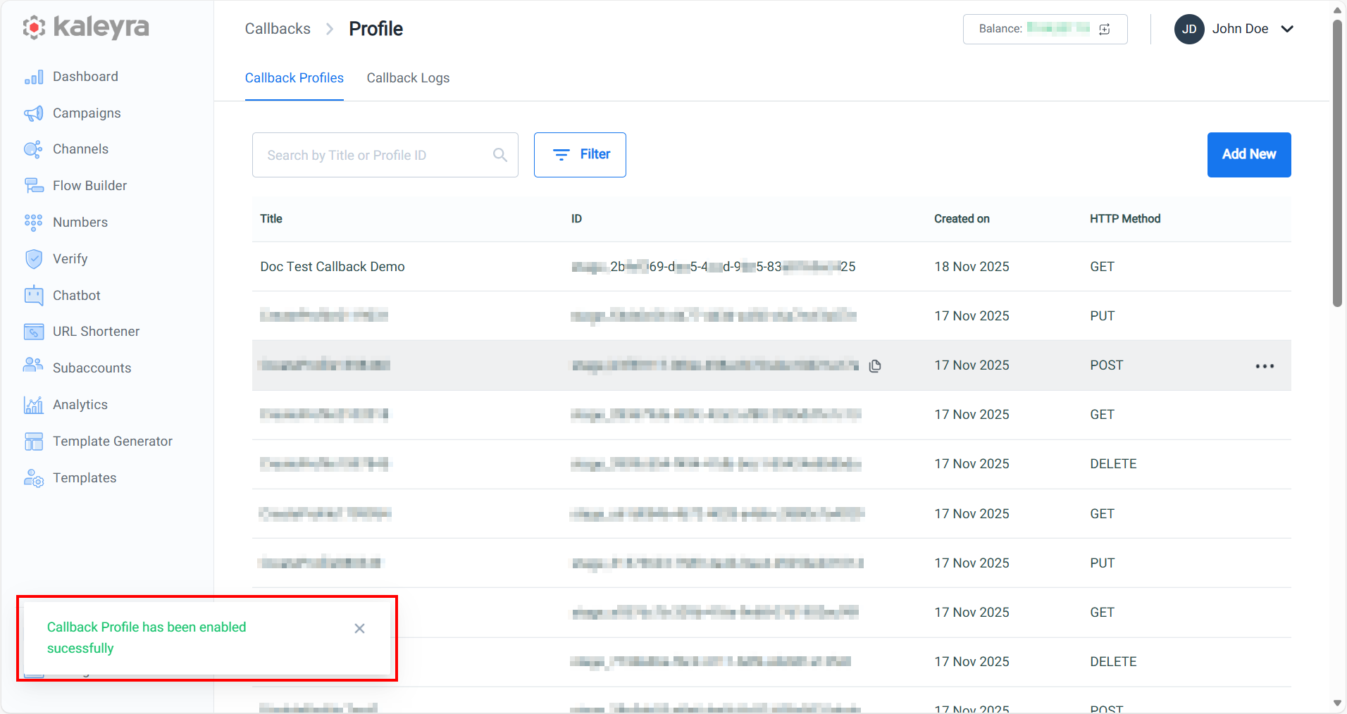- Click Save to save the callback profile in your kaleyra.io account. The confirmation message Callback Profile has been created successfully appears.
