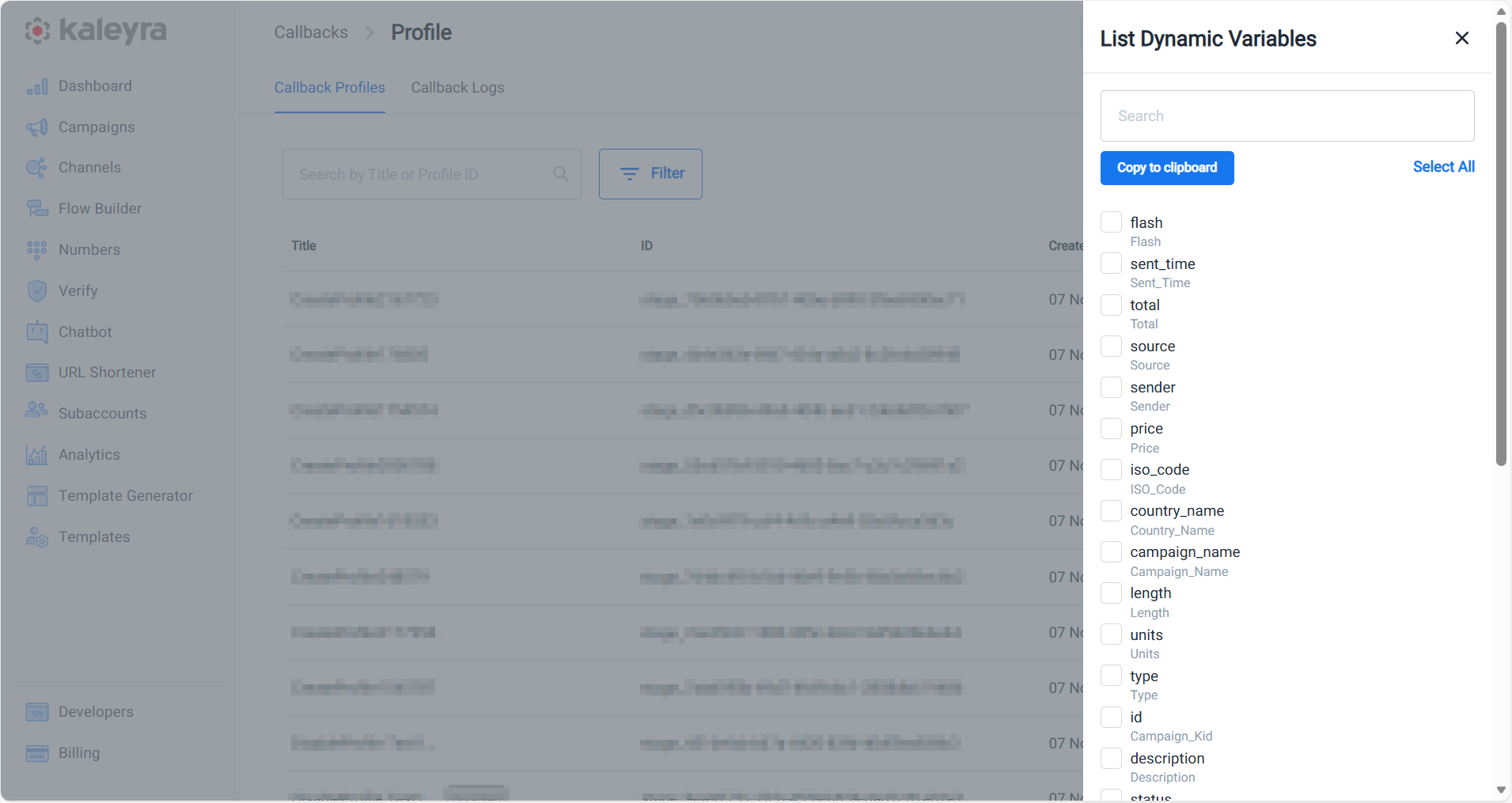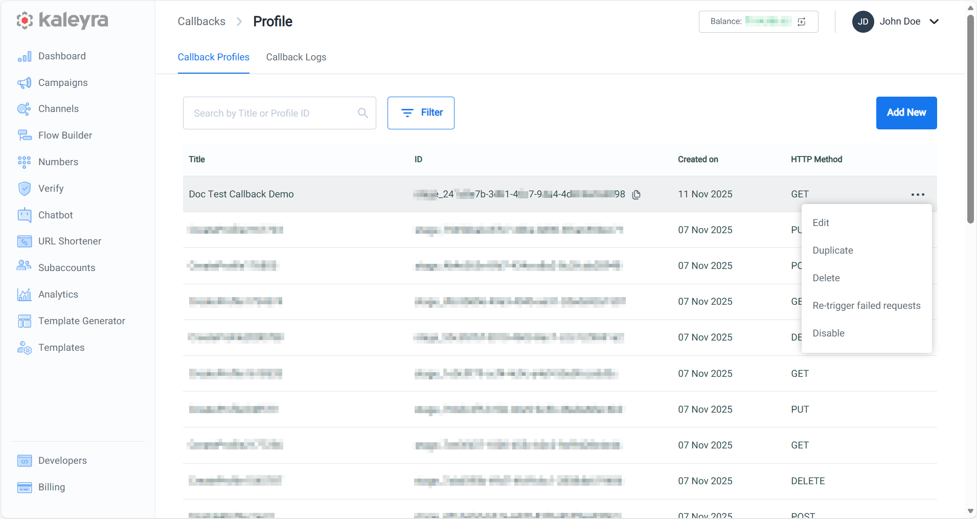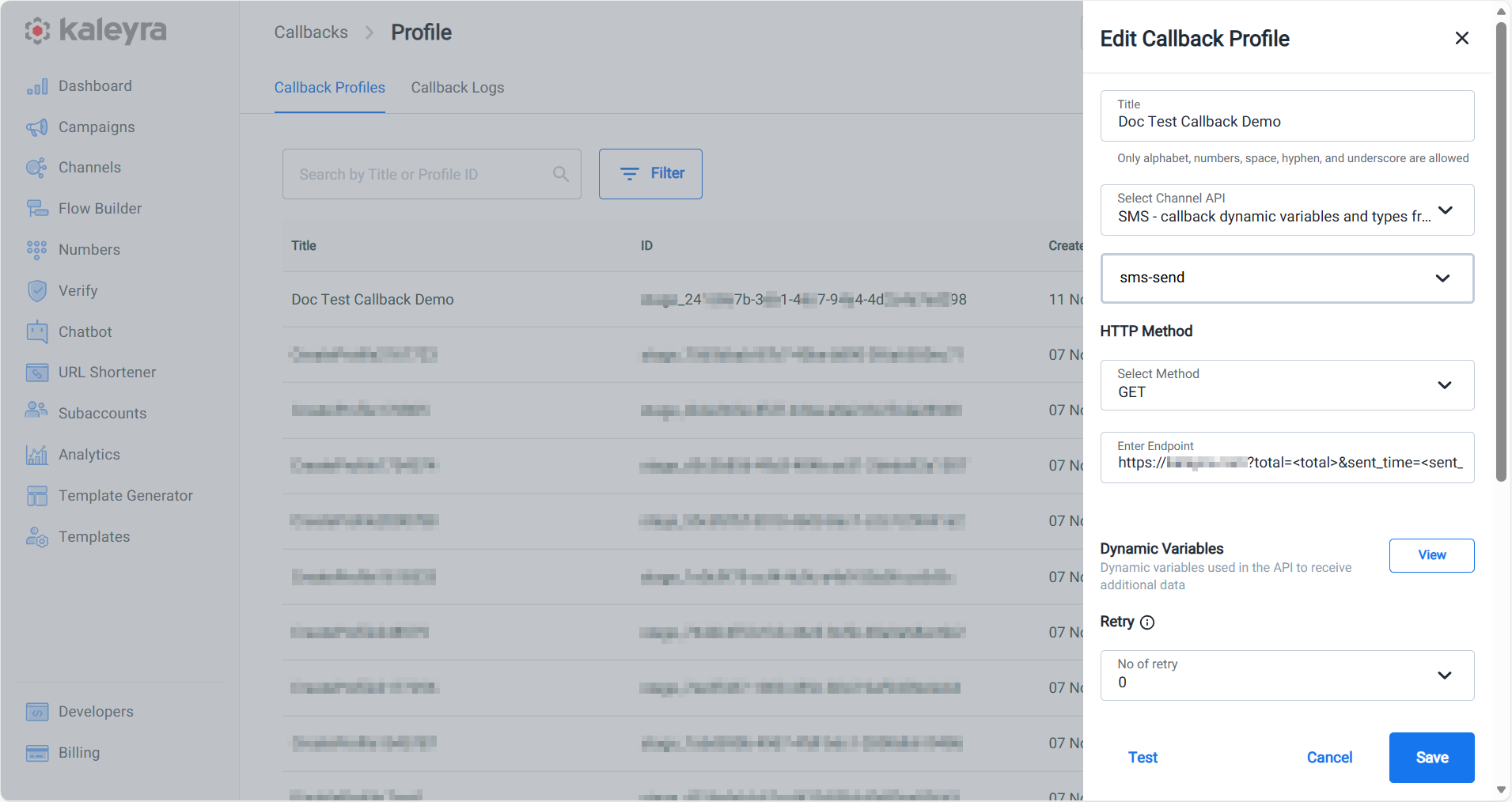 After creating a callback profile, a unique 'callback profile ID' is generated. You can use this callback profile ID for configurations within the UI and in your API requests, whenever you require to receive real-time updates related to a specific resource (for example, a recently sent SMS).