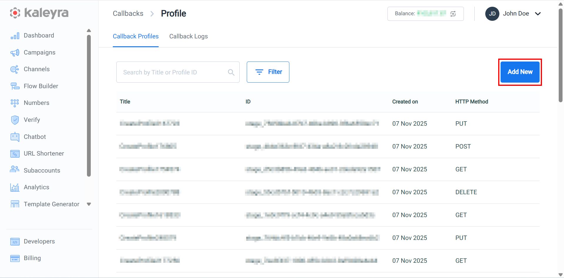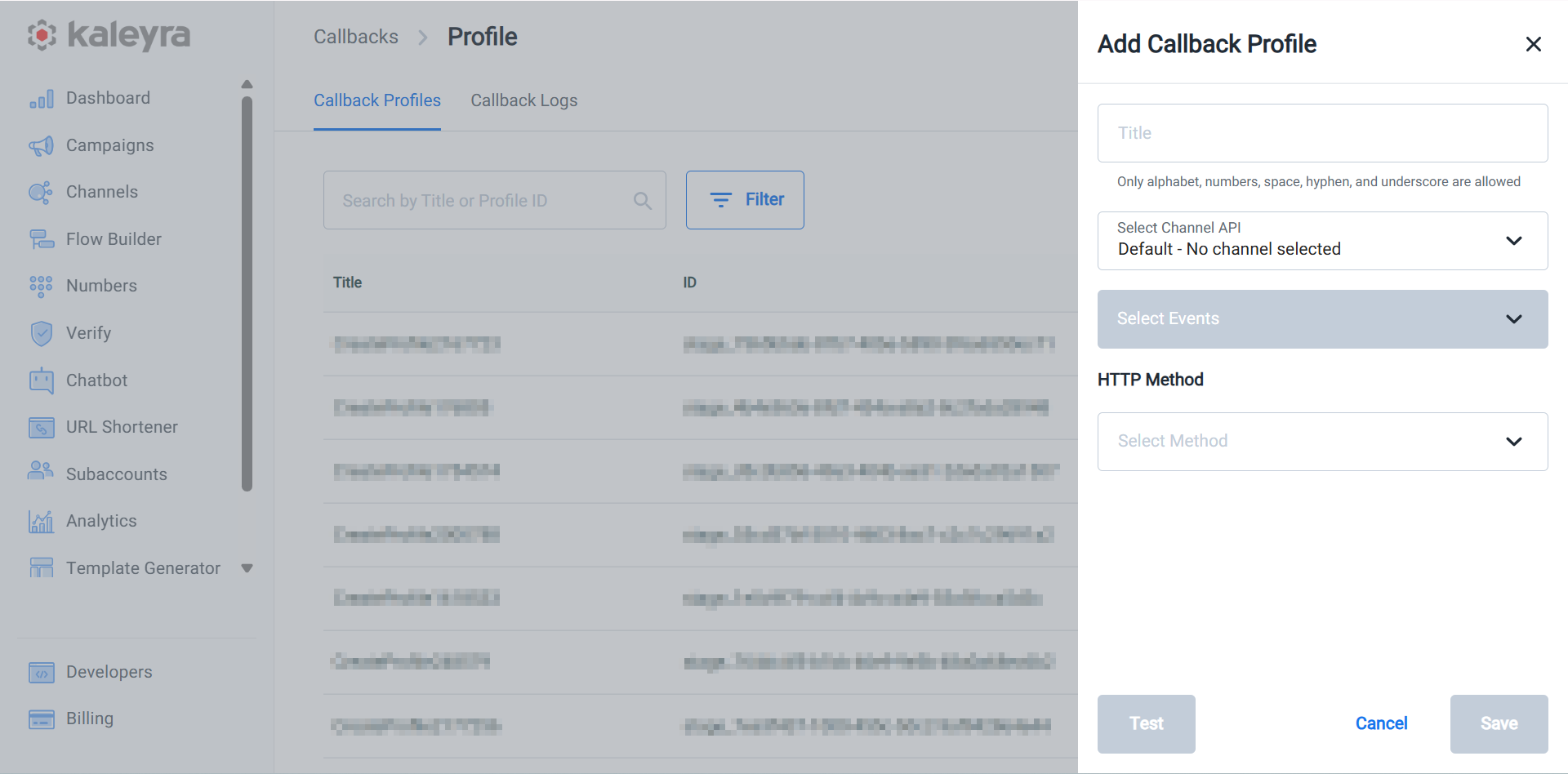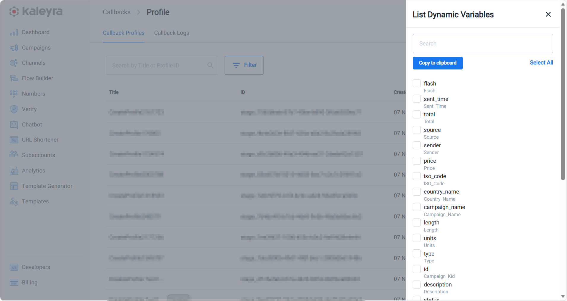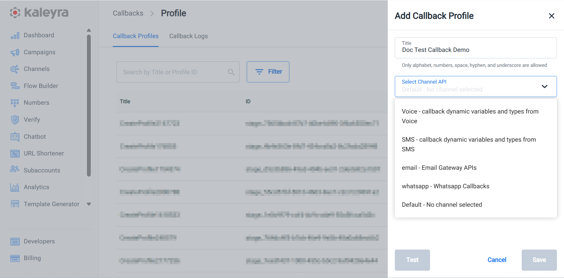 After creating a callback profile, a unique 'callback profile ID' is generated. You can use this callback profile ID for configurations within the UI and in your API requests, whenever you require to receive real-time updates related to a specific resource (for example, a recently sent SMS).