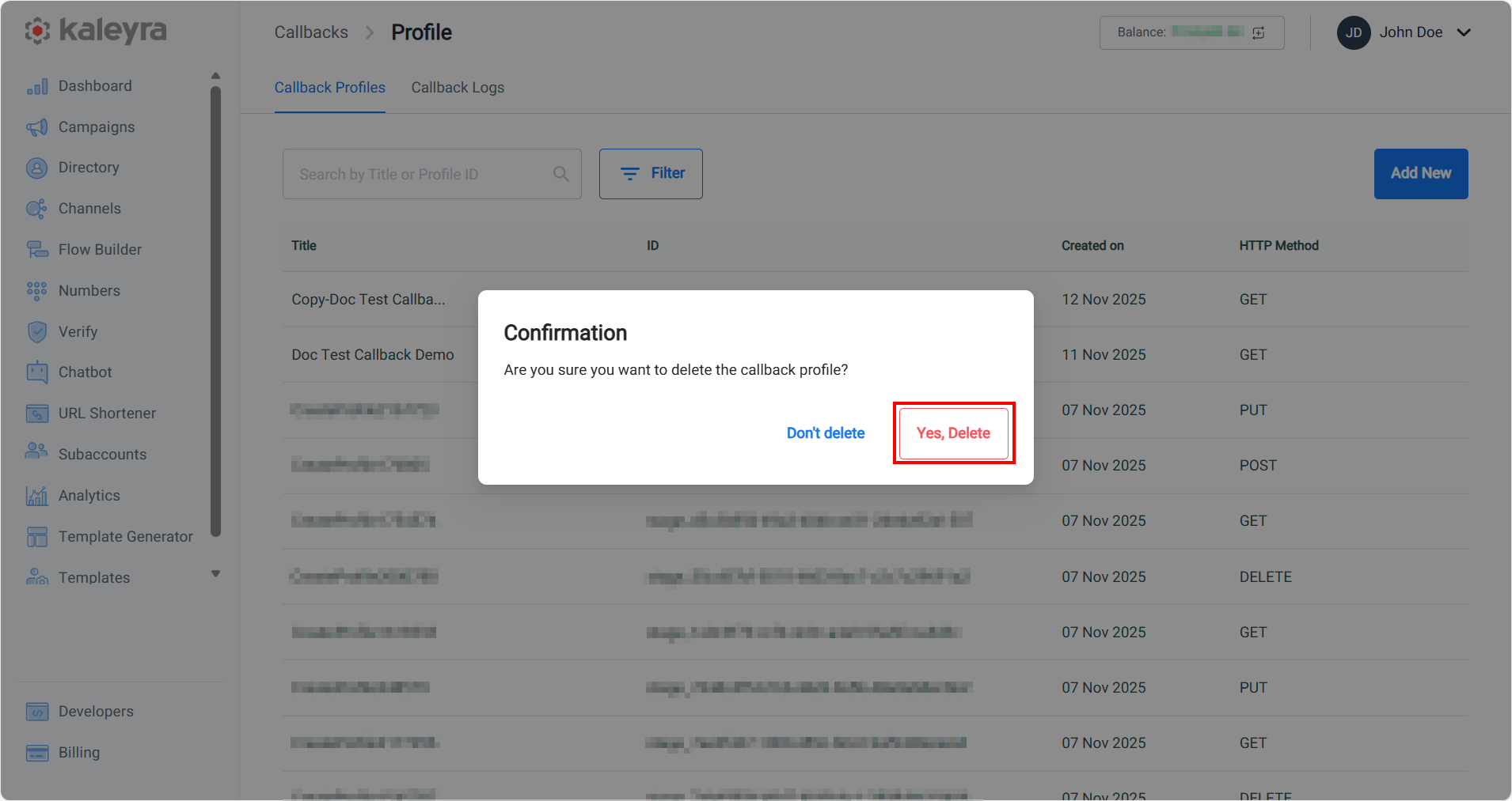 - Click Yes, Delete to delete the callback profile. A success message is displayed indicating that the callback profile has been deleted.