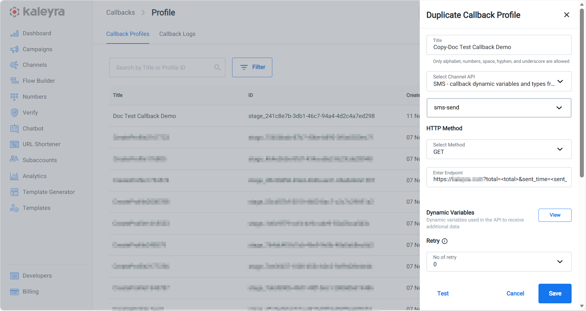 - Click Test to send a callback to your endpoint based on the configuration just set in the callback profile to see if the callback is working as expected.