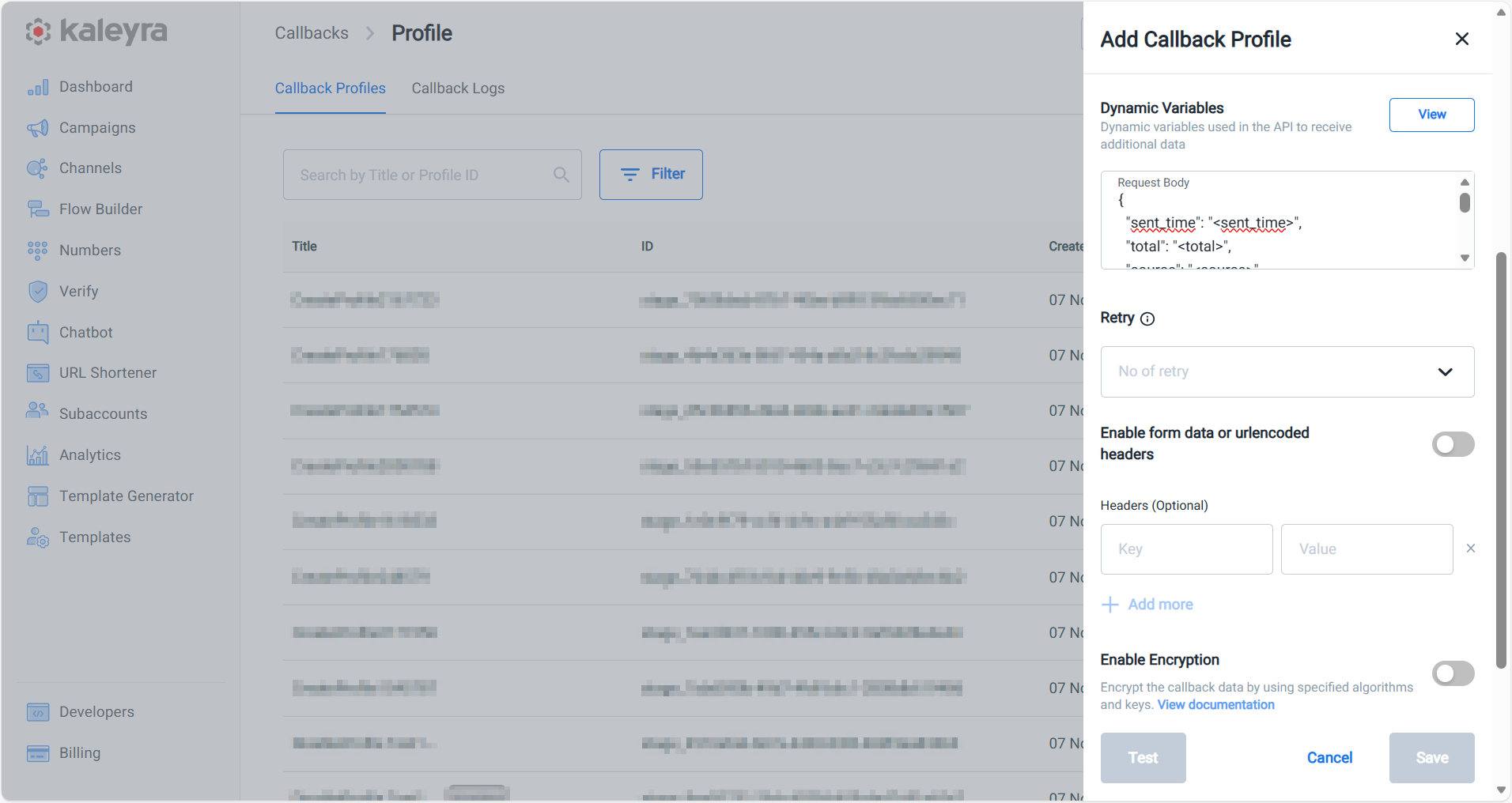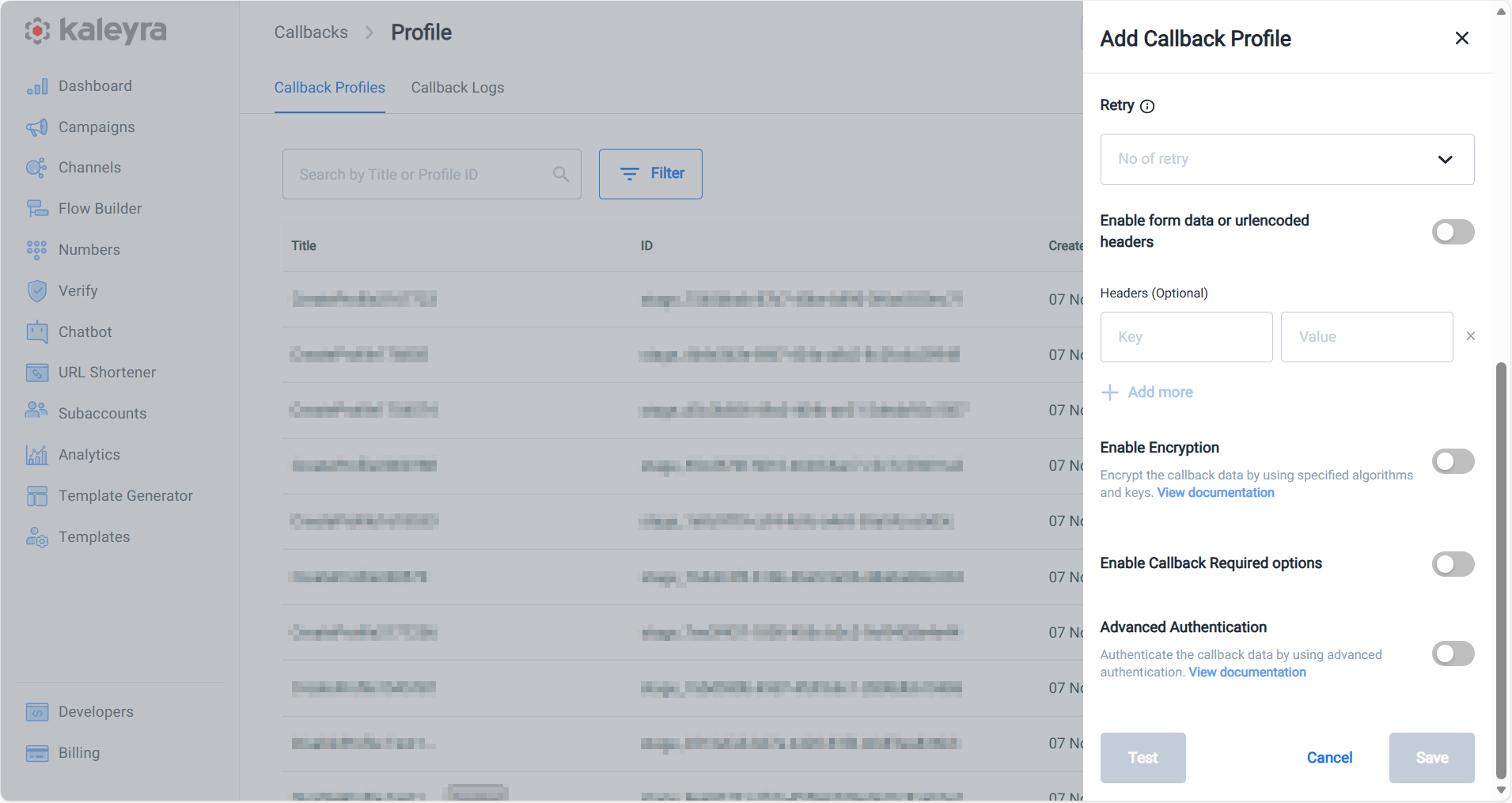You can create a callback profile tailored to your specific requirements. A callback profile offers a set of common options including the HTTP method to send the updates to your designated endpoint. The interface provides the flexibility to add additional HTTP headers to be included in the callback for validation purposes as well as for Basic and Advanced Authentication. All callbacks sent from the Kaleyra platform to our endpoint are encrypted in transit using TLS, to ensure content security further, you can encrypt the callback information as per your preferences. Further, you can configure specific attributes within each callback profile to receive the desired information at your endpoint.