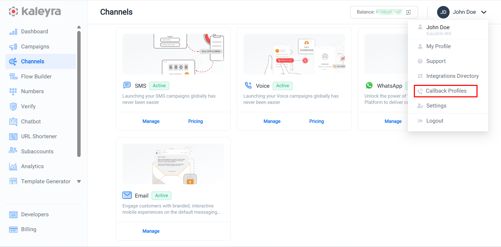 Using the 'Callback Profiles' feature, you can create callback profiles to receive essential information and updates about various aspects such as SMS status, WhatsApp delivery status, and incoming WhatsApp messages.