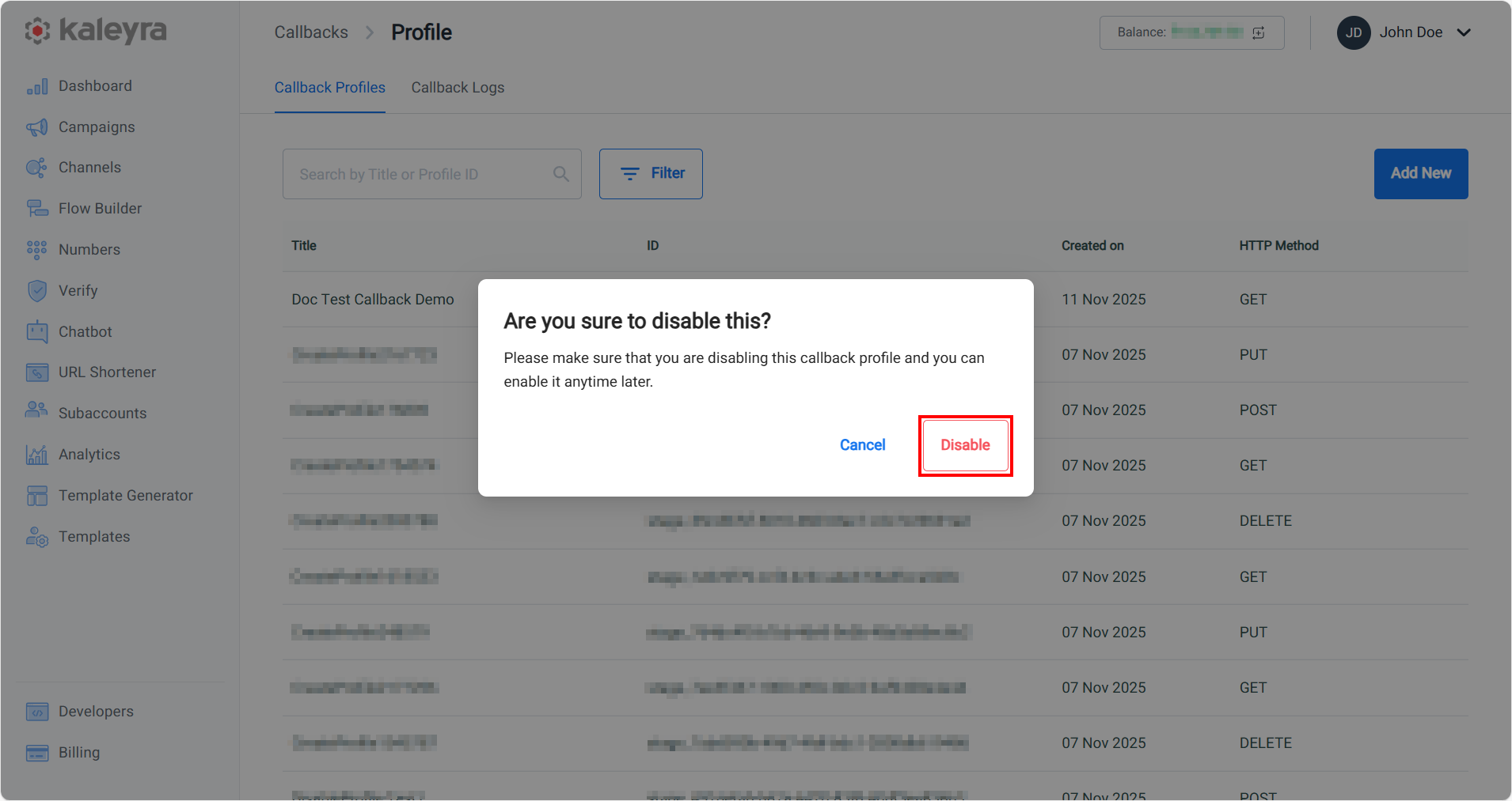 - Click Disable to disable the callback profile. A success message is displayed indicating that the callback profile has been disabled. The disabled callback profile will be marked as Disabled.