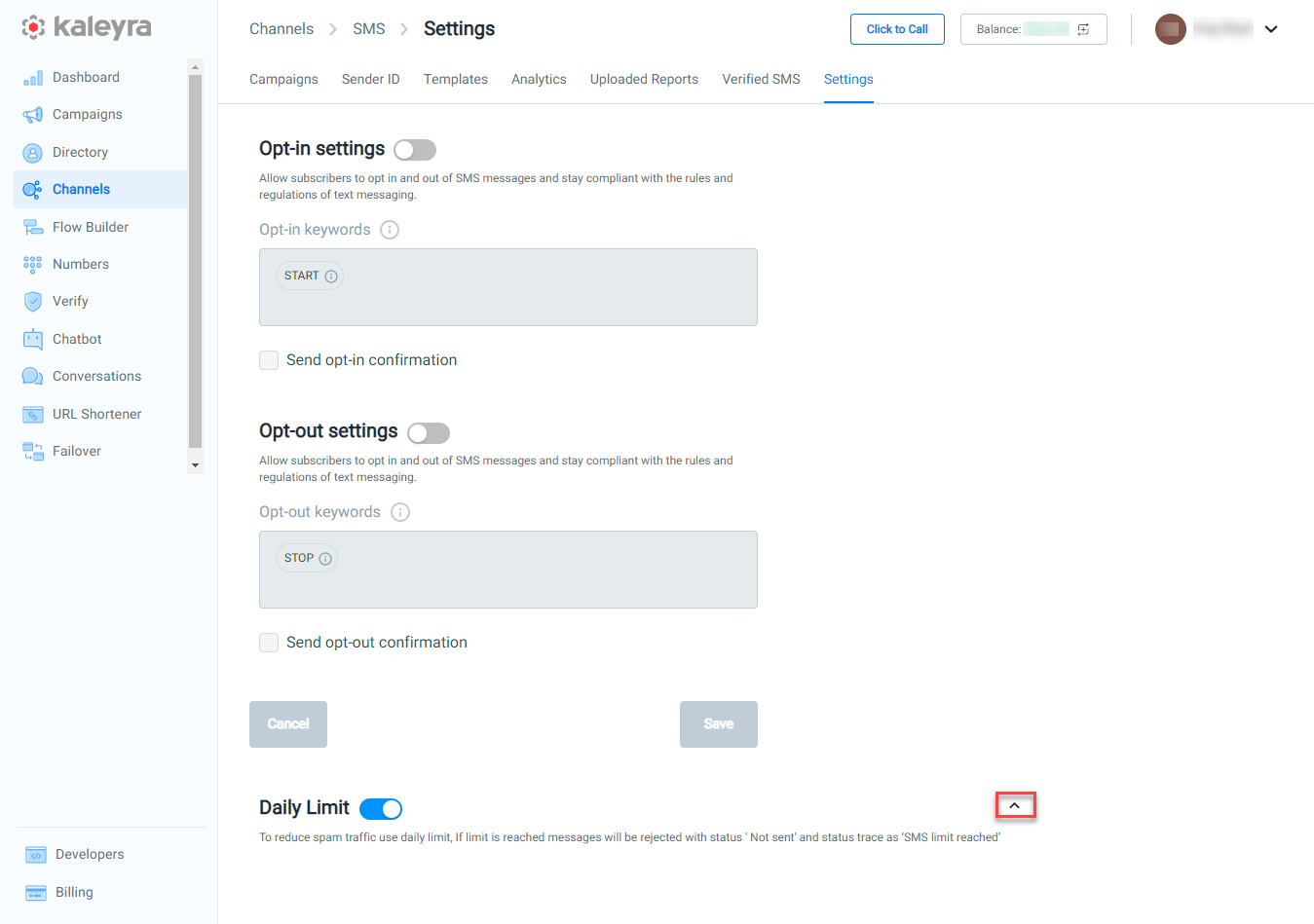 Note:By default, the Daily Limit is disabled for your account. To change the settings, toggle Daily Limit. After enabling the daily limit, there is no default limit set for the Daily Limit.