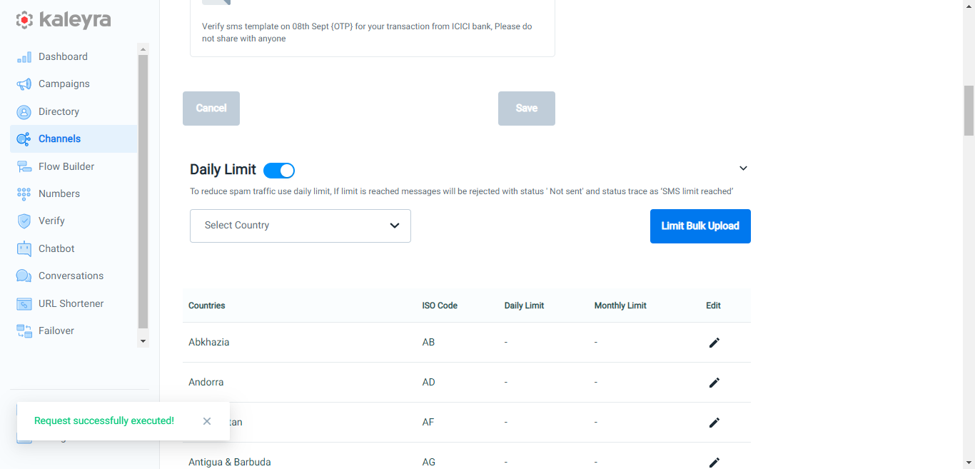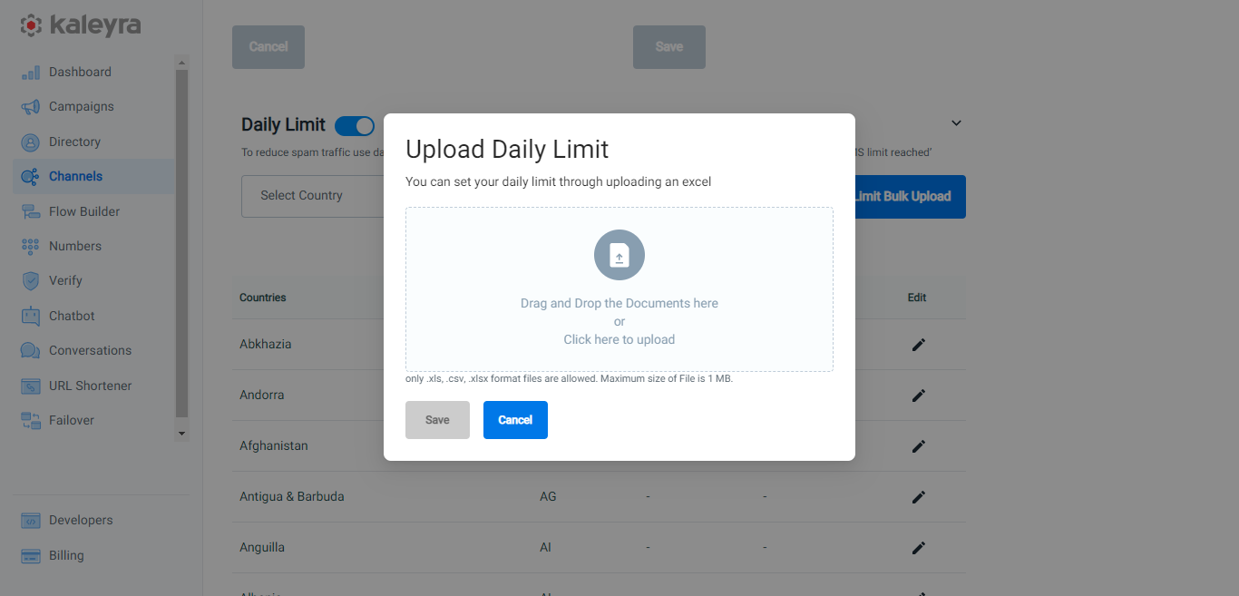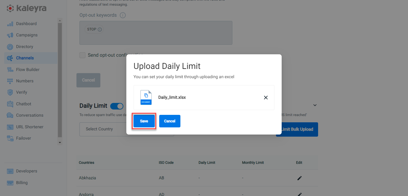 - If you want to update the daily limit in bulk, then you must enter the ISO Code of the countries, Daily Limit, and Monthly Limit as the column of a .xls, .csv, or .xlsx file format. The maximum size of the File should not be more than 1 MB.