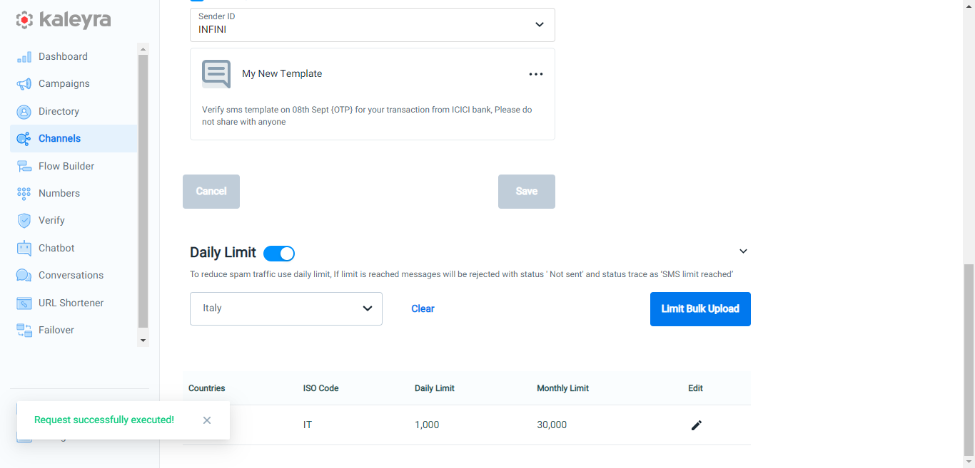 - You can not enter the message limit as zero for the Daily Limit OR Monthly Limit fields.