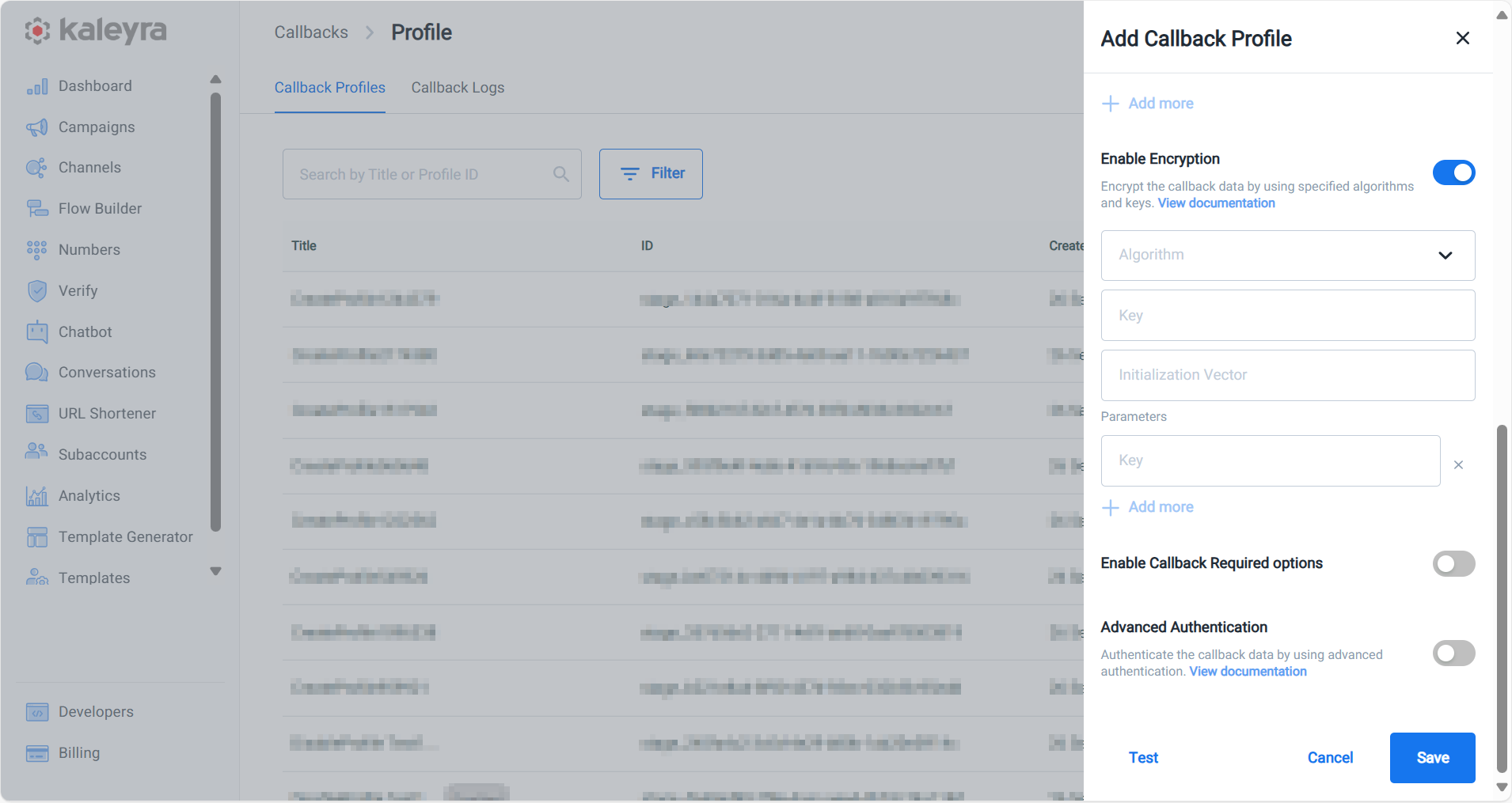 To enable encryption of the callback information, toggle the Enable Encryption button. The Algorithm, Key, Initialization Vector, and Parameters fields appear.