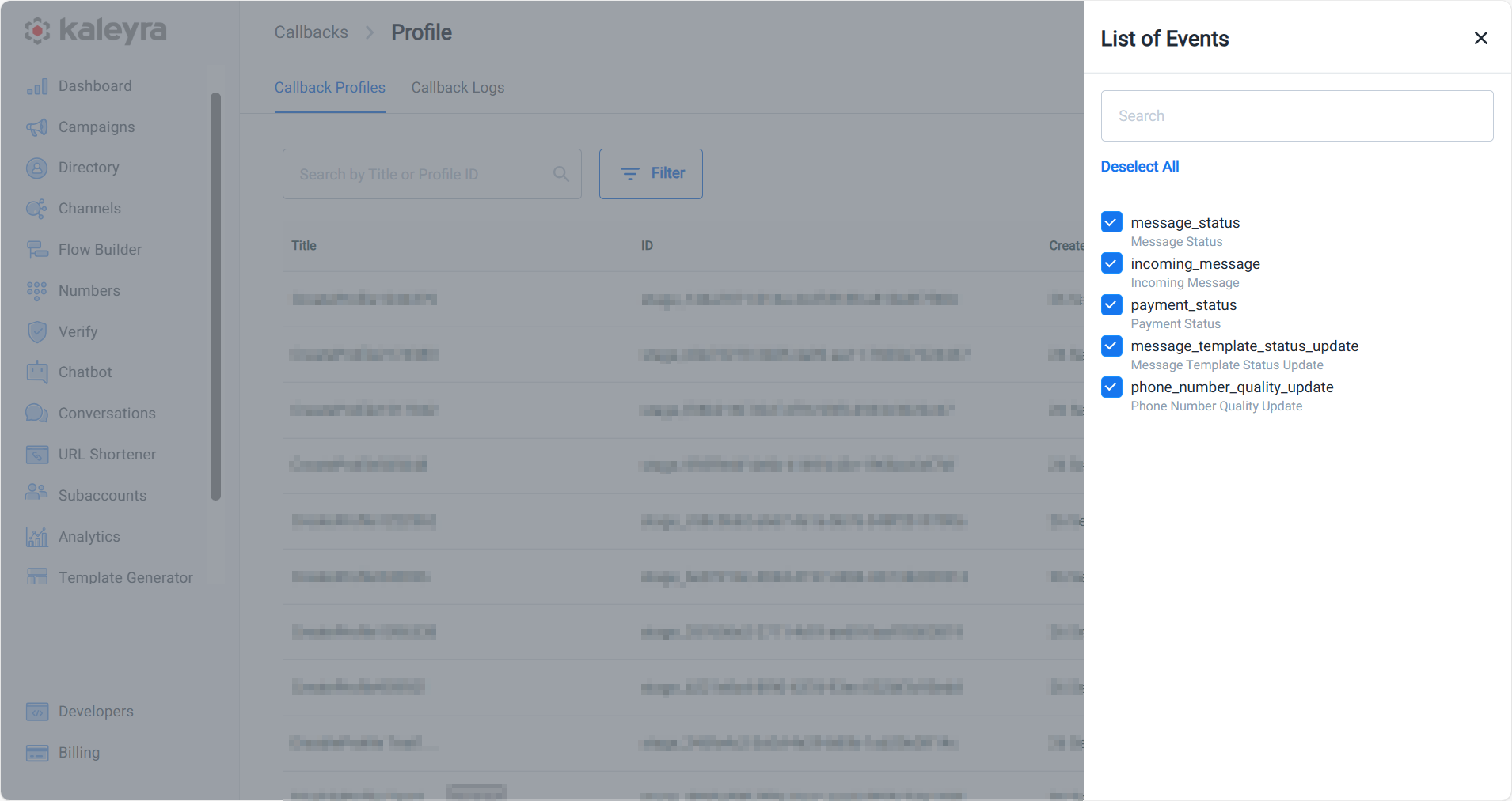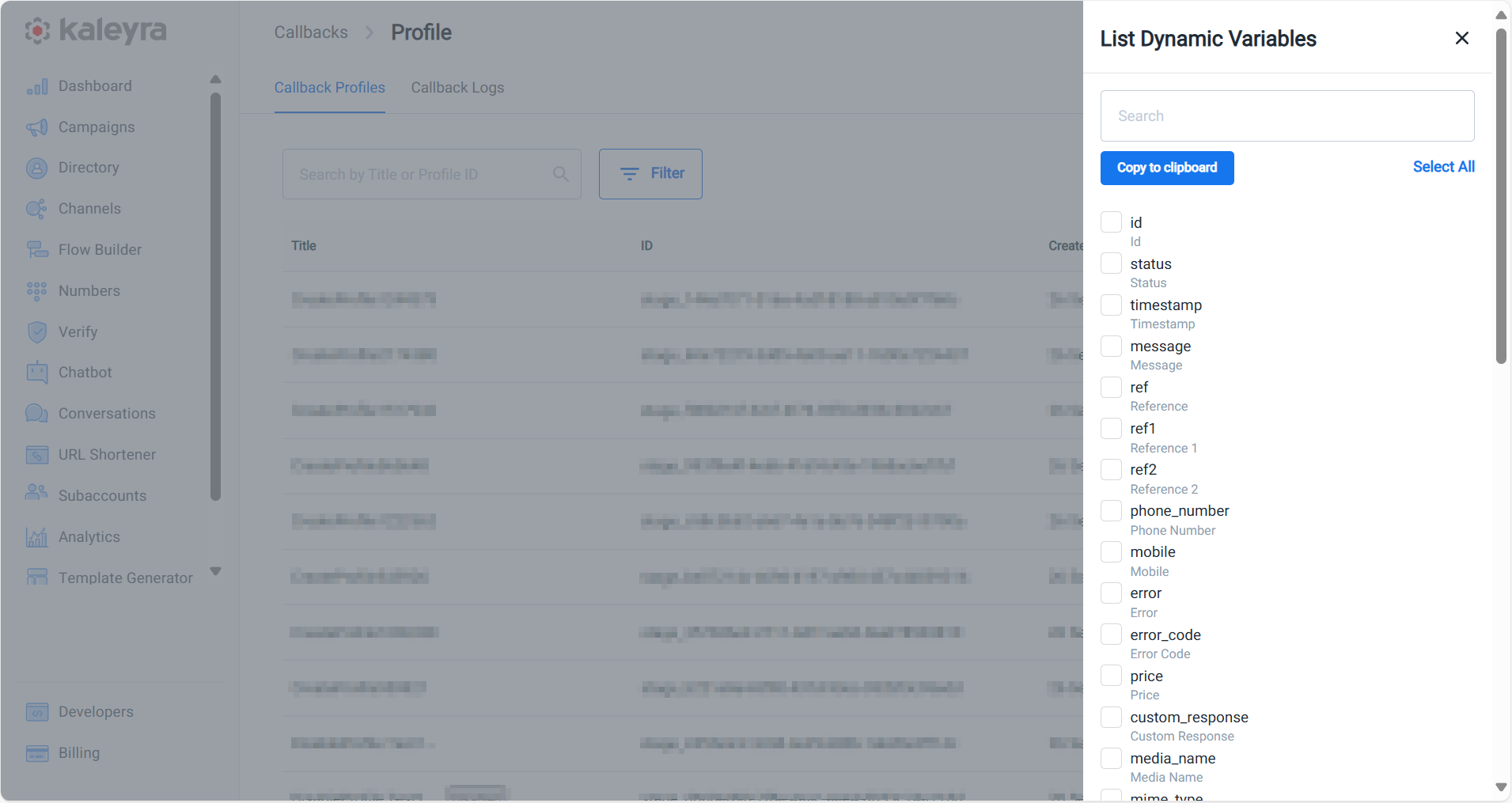 For example, you can configure your callback profile to receive updates about message status, incoming message, message template status, payment status, and phone number quality update. While creating a callback profile for the WhatsApp channel, the Kaleyra platform provides a list of WhatsApp related events you can chose to receive updates for and for each events, the kaleyra platform provides a list of attributes you can receive as part of the updates. Such attributes, called “dynamic variables" can be selected as you like so to match the set of information you are interested in. The "dynamic variables" list serves as a ‘ready reckoner’ to add the callback variables without having to know the variable names. Whenever Kaleyra platform receive an update from Meta matching the events you have configured in your callaback profile, the value for the “dynamic variable” configured is fetched and sent to your endpoint.