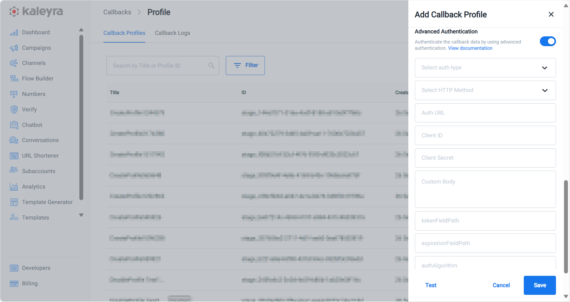 To enable the advanced authentication for WhatsApp callback, toggle the Advanced Authentication button. The Advanced Authentication fields appear.