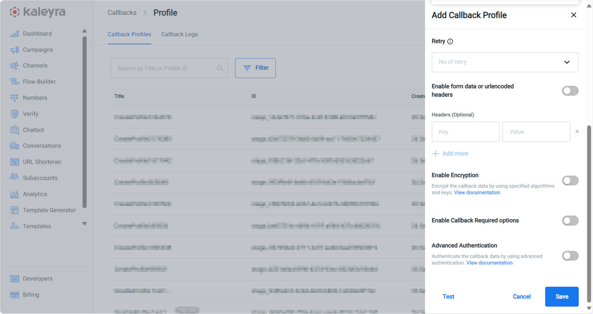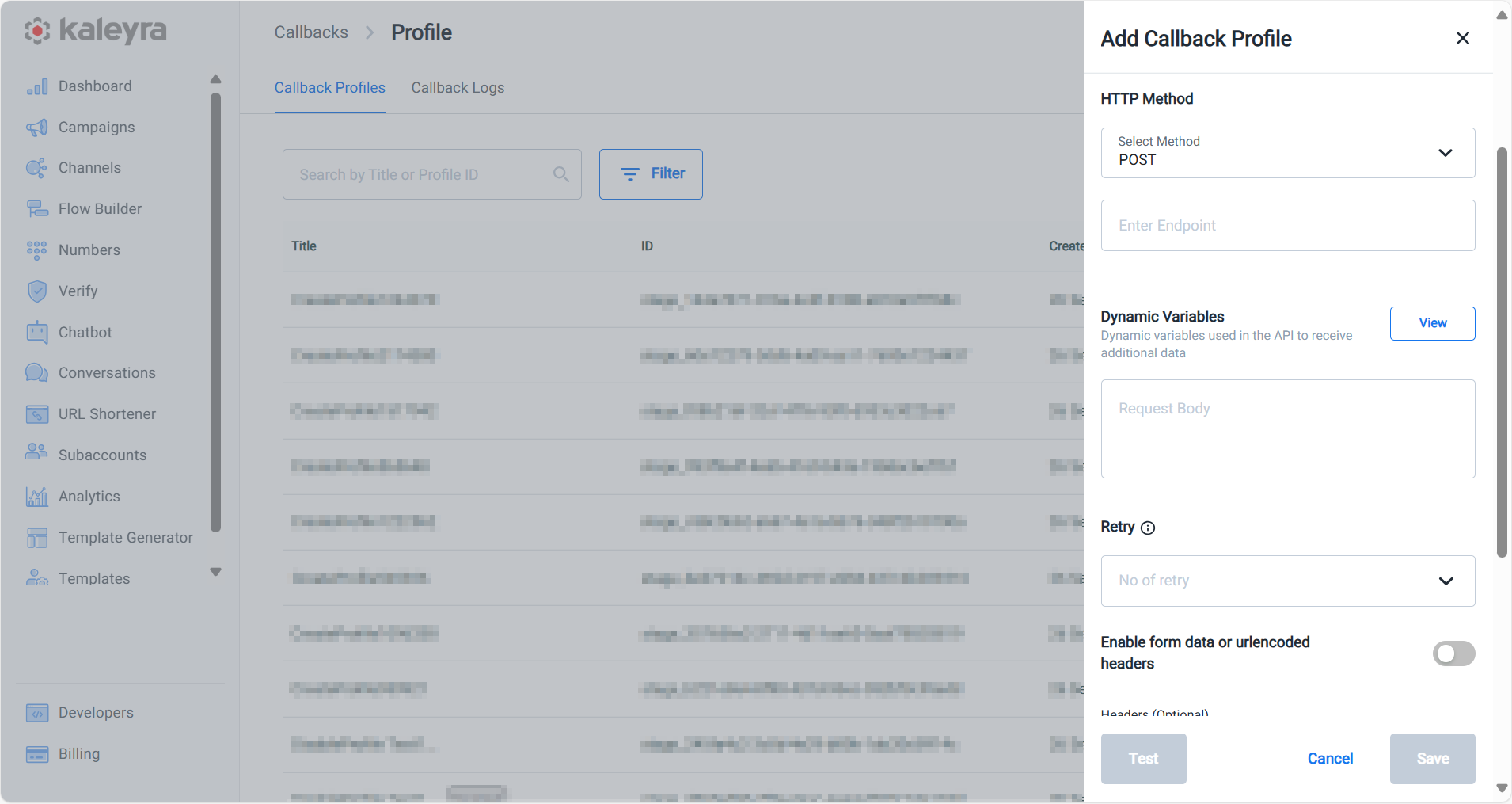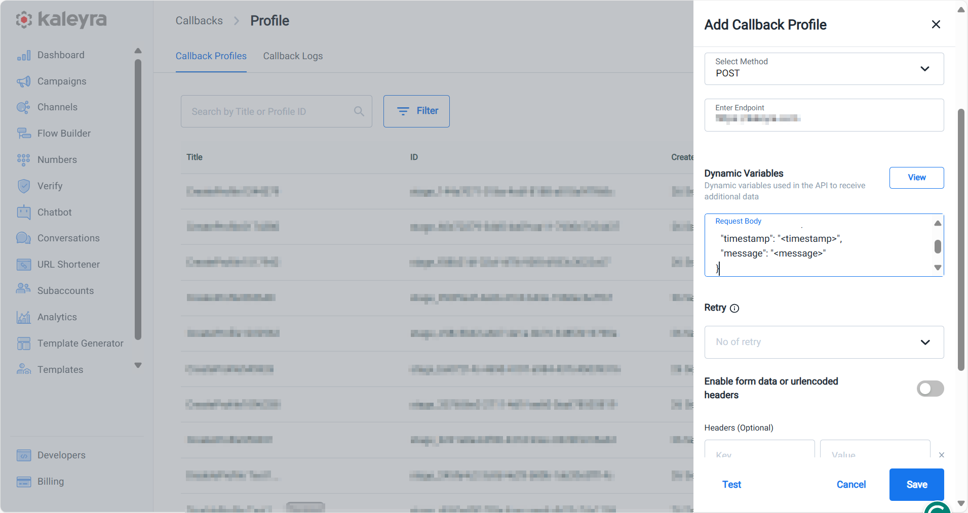 From the Retry drop-down, select the number of retries that Kaleyra Platform will perform in case the first callback receive a failure response or no response from your endpoint. You have the option for 0, 1, and 2. For assistance with more than two retry attempts, you can contact the Support team.