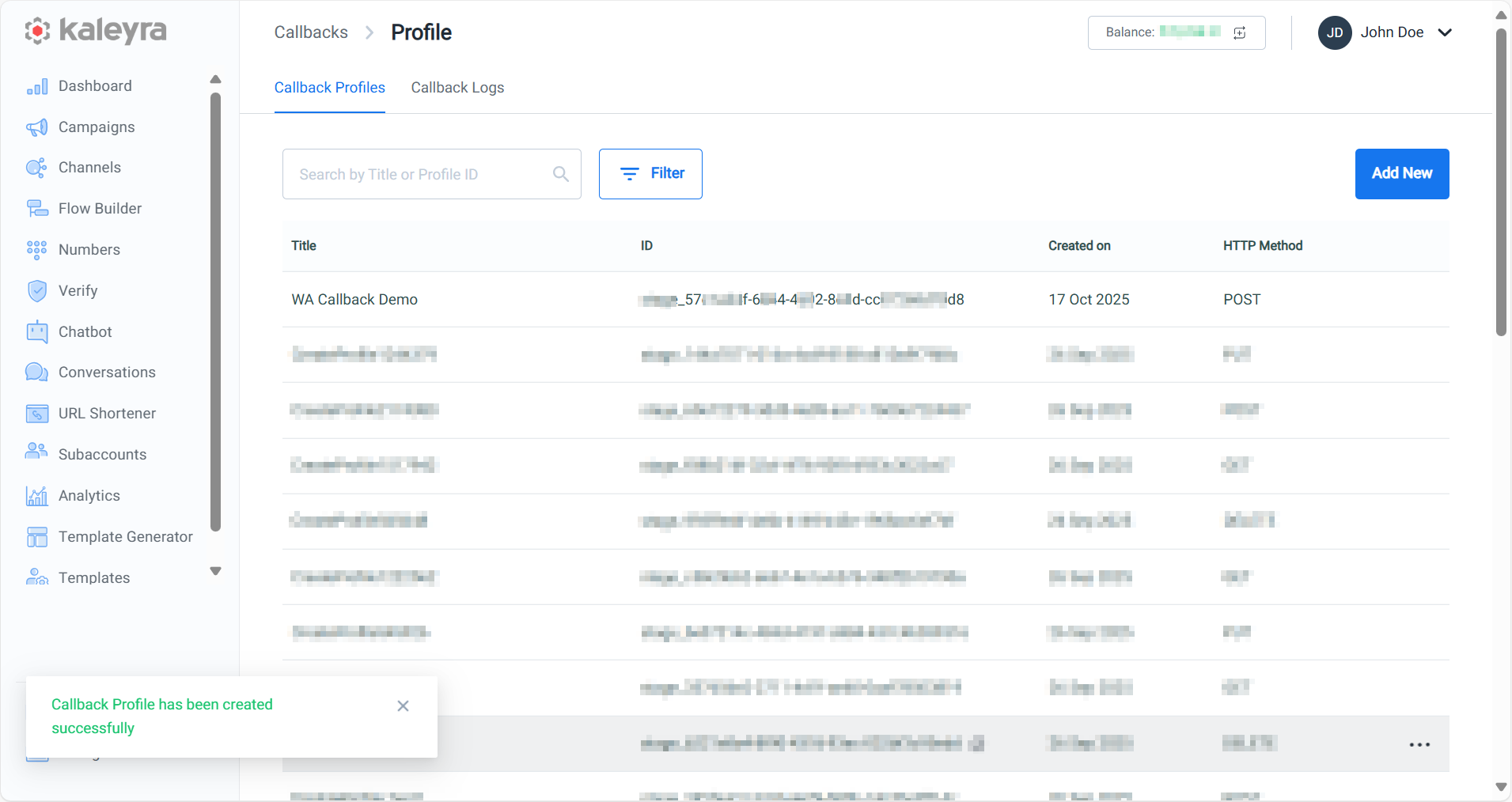 - Click Save. The confirmation message Callback Profile has been created successfully appears and the added callback appears in the Callback Profiles page.