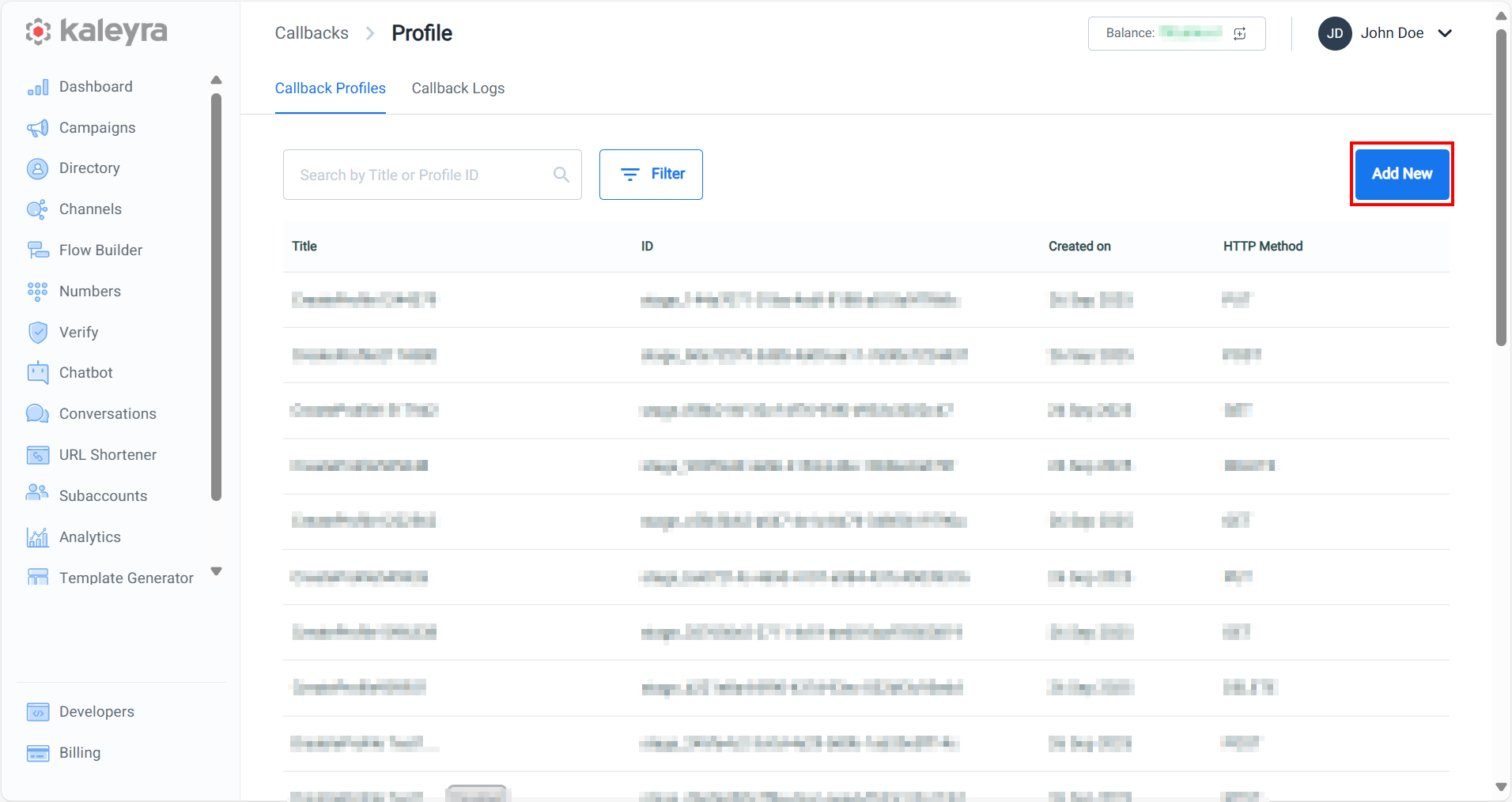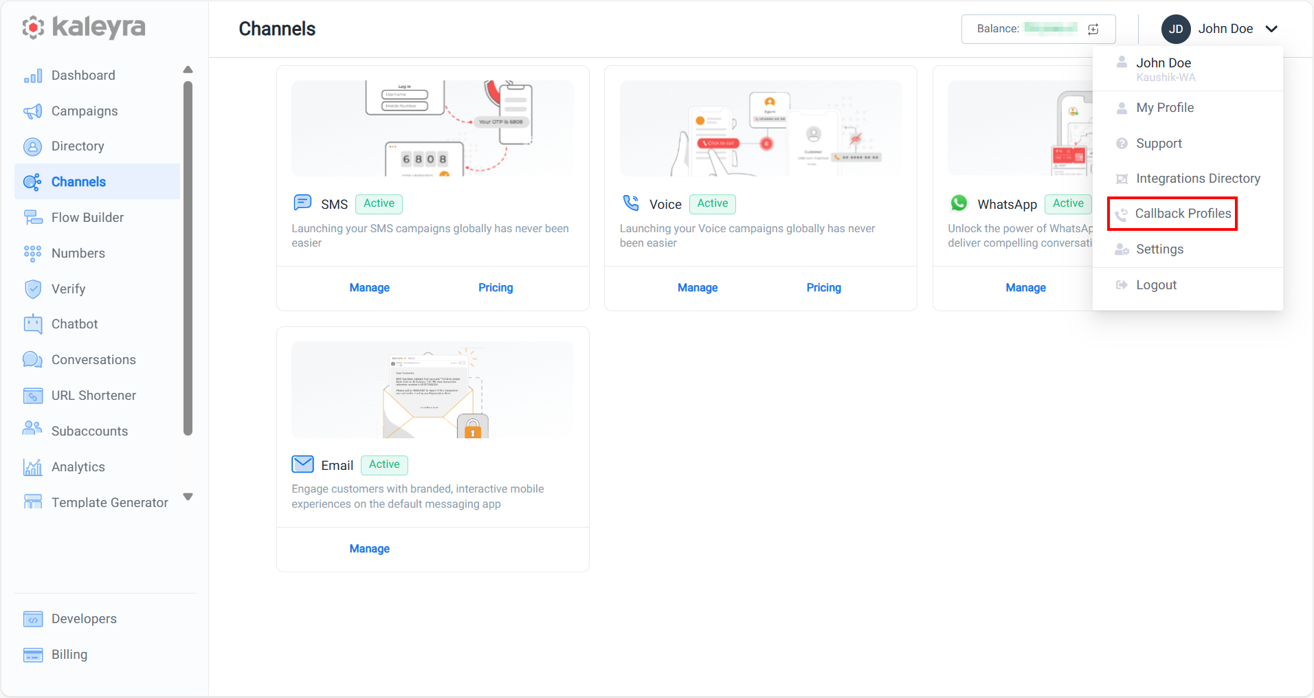 To create a callback profile for receiving updates about WhatsApp events, perform the following steps:
