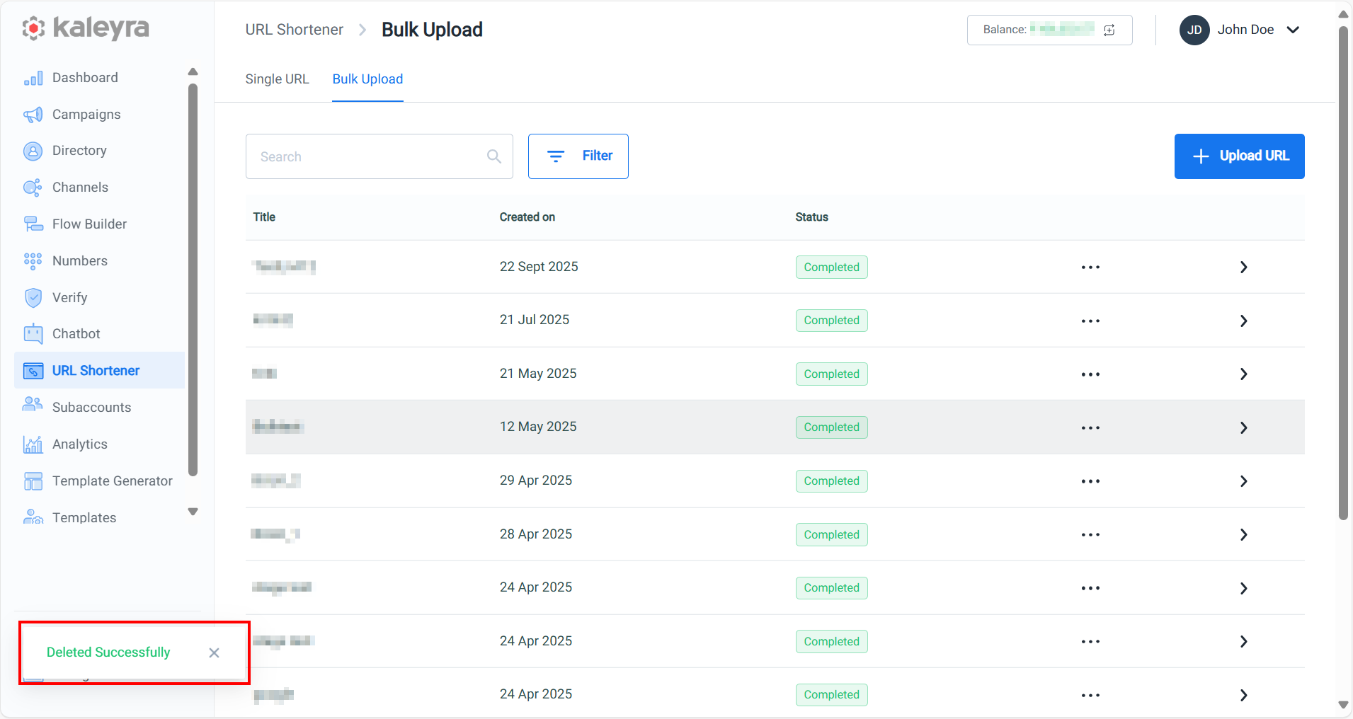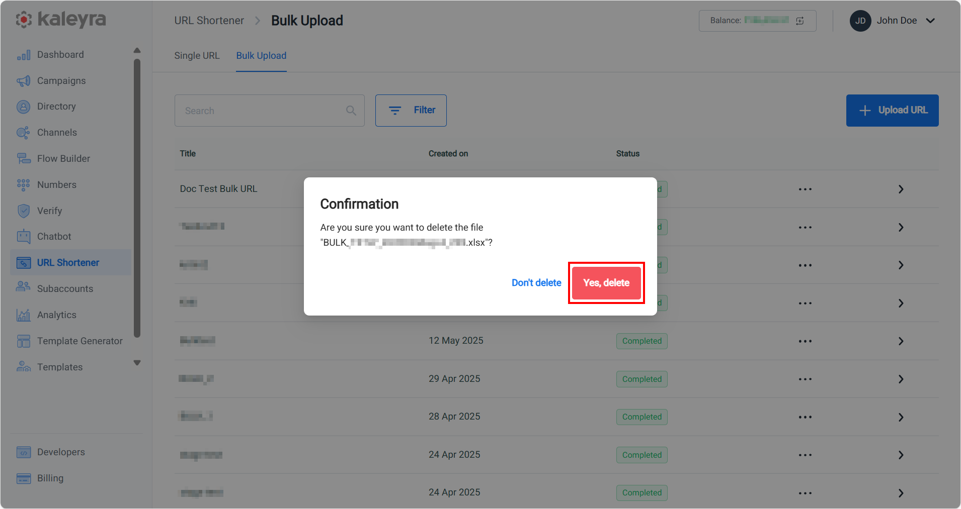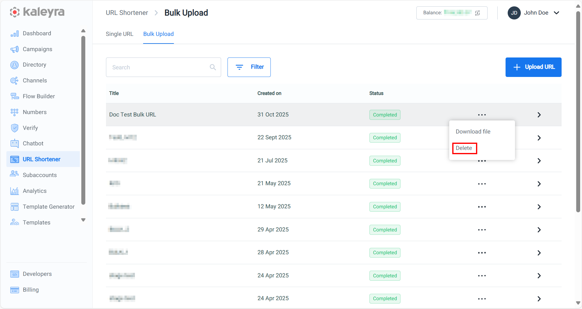 You can delete the file with multiple shortened URLs, either it is pending or approved by the Kaleyra platform. If you delete the file, then all the shortened URLs associated with the file get deleted (in case it is approved). If you are using the shortened URL in a campaign or anywhere else, then the shortened URLs will not work.