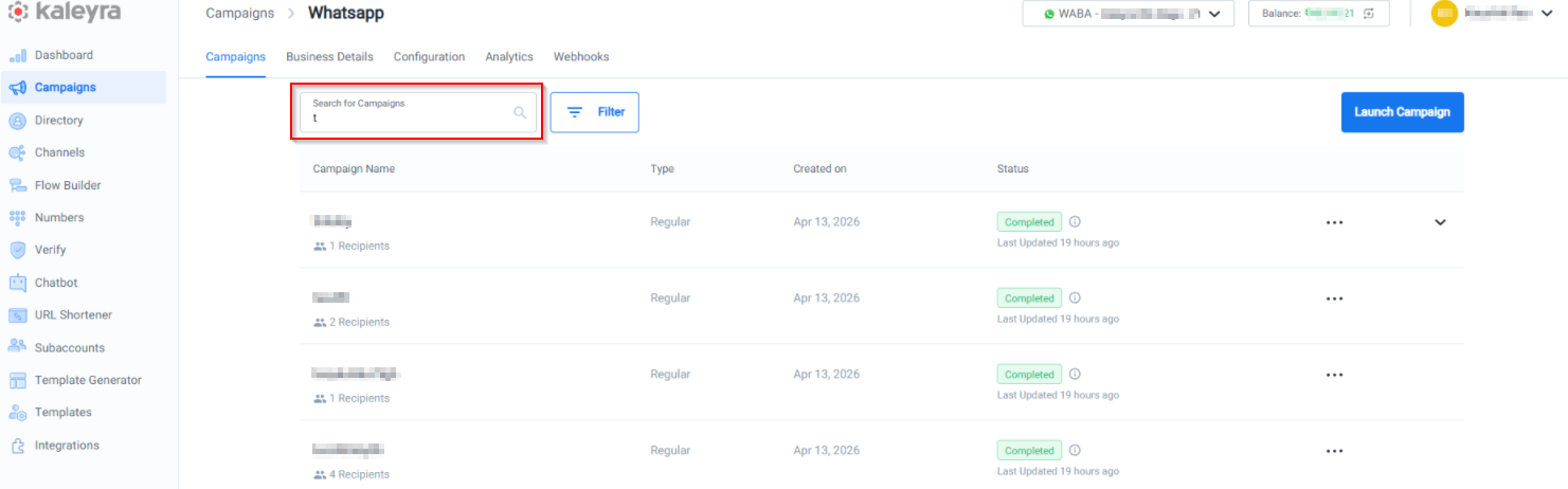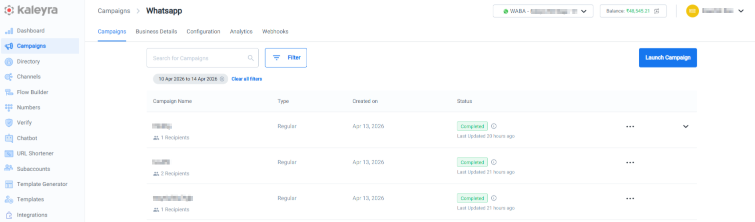 - On the WhatsApp Campaigns list, click Launch Campaign.