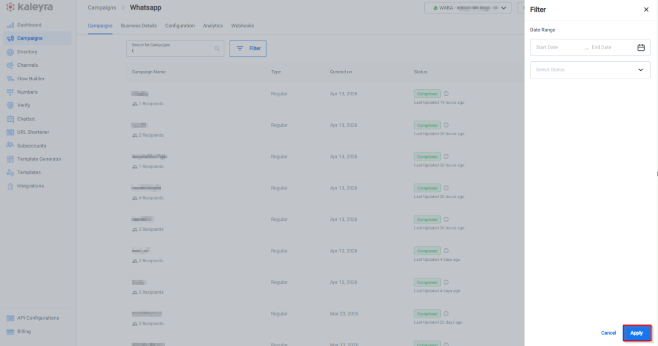 - Click Apply. The Campaigns list as per the selected filters appears.
