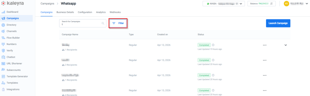 - To search for a specific campaign, click Filter on the WhatsApp campaigns list.