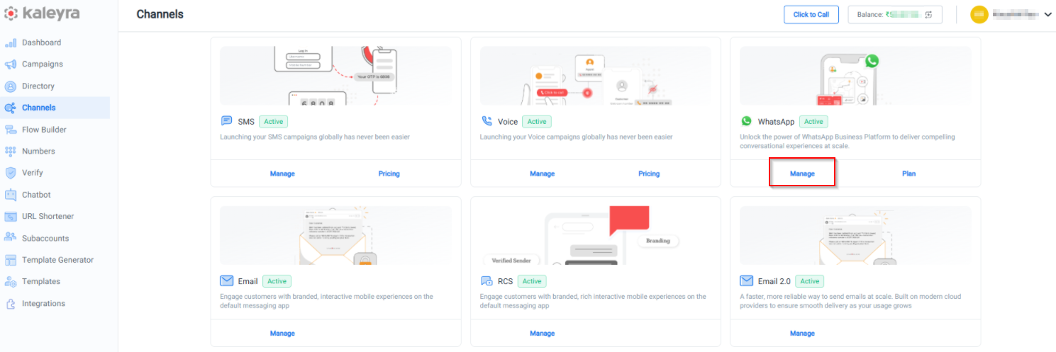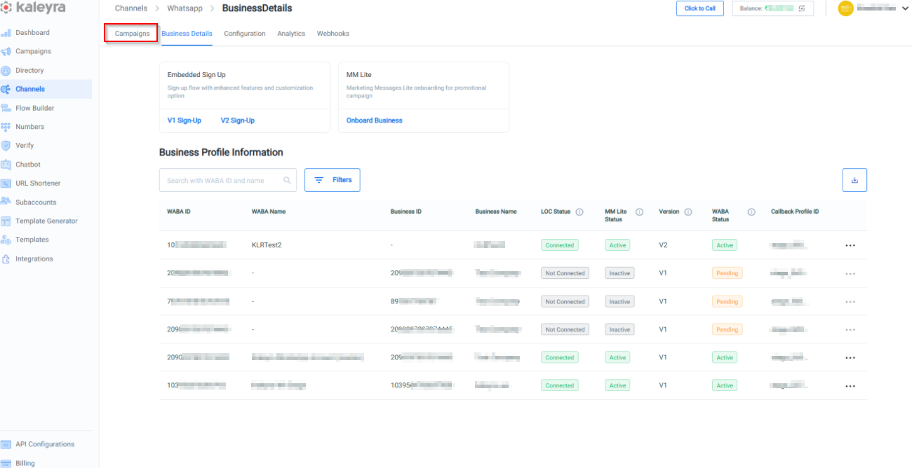 - After signing into your accountKaleyra.io account, go to Campaigns and then click WhatsApp.