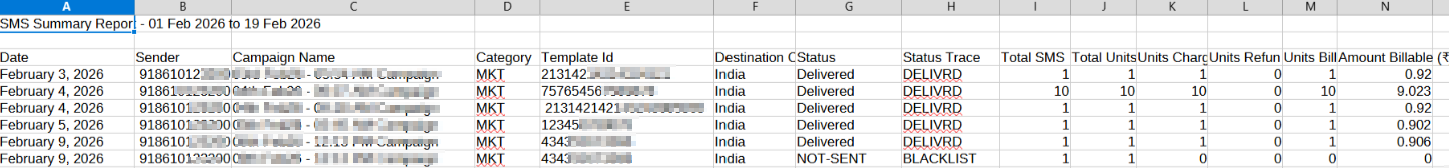 Sender | Displays the sender ID. A Sender ID is a unique name or standard mobile number that shows in the “from” field of your text messages on your phone. It could be a phone number, an alpha-numeric, an alphabetic, or a numeric alias. | 91861012XXX |
