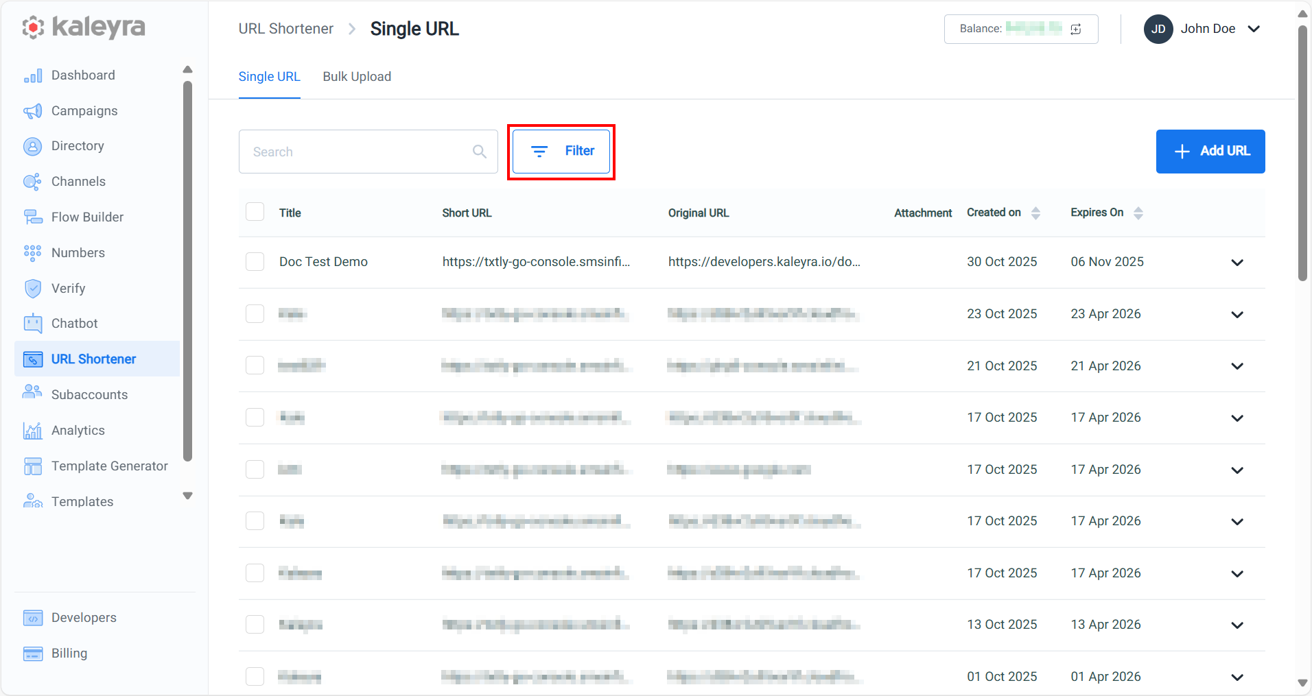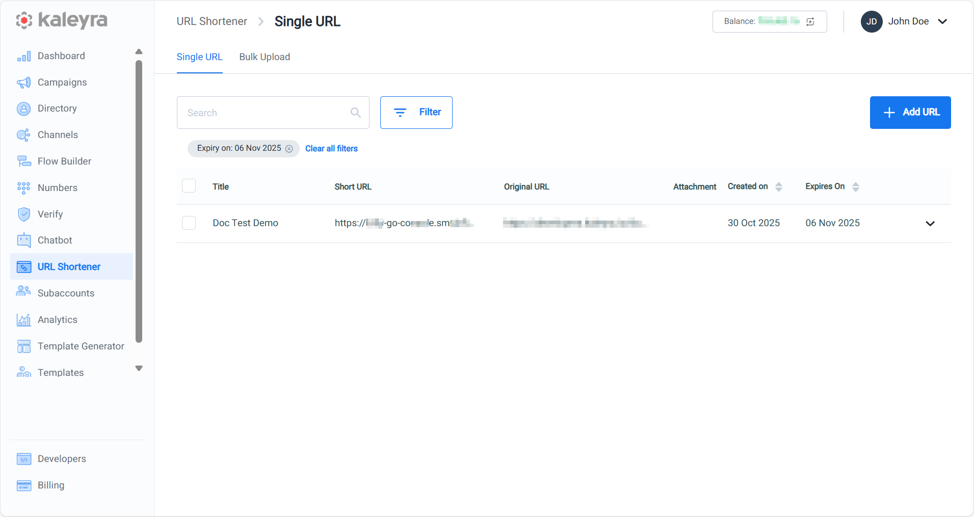 - URL Expires on - You can filter based on URL expiry date. The filtered results will display all shortened URLs that are set to expire on the specified date. In this case, November 6, 2025 is selected.
