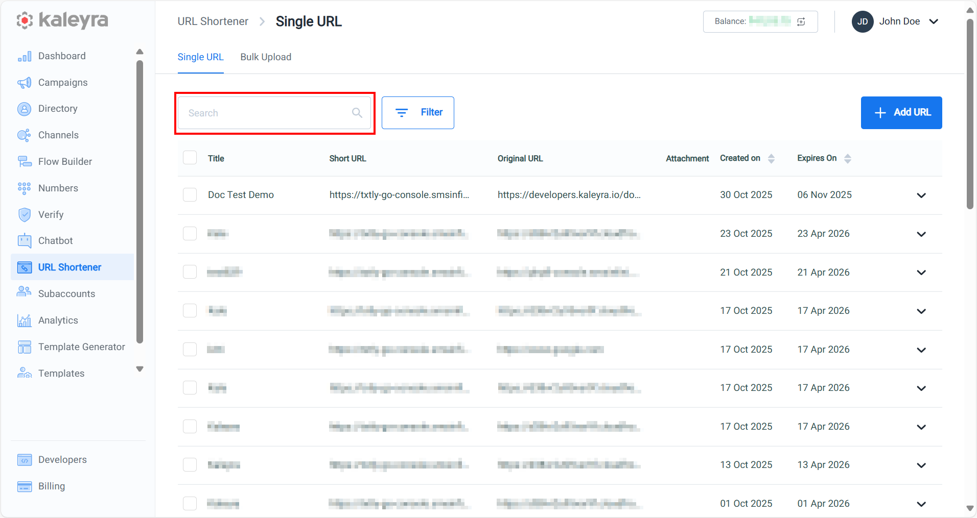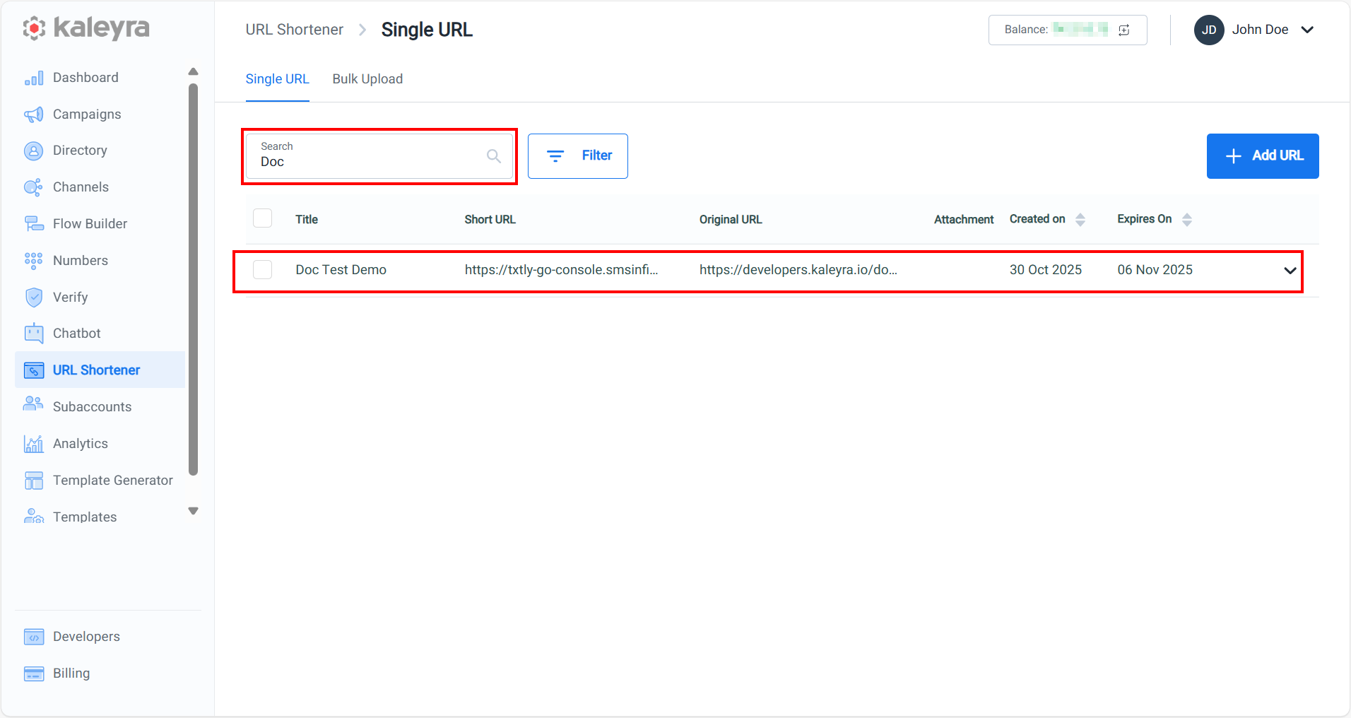 - In the Search field, enter the keywords based on which you want to search the Shortened URL. For example, Doc Test the search results appear automatically.