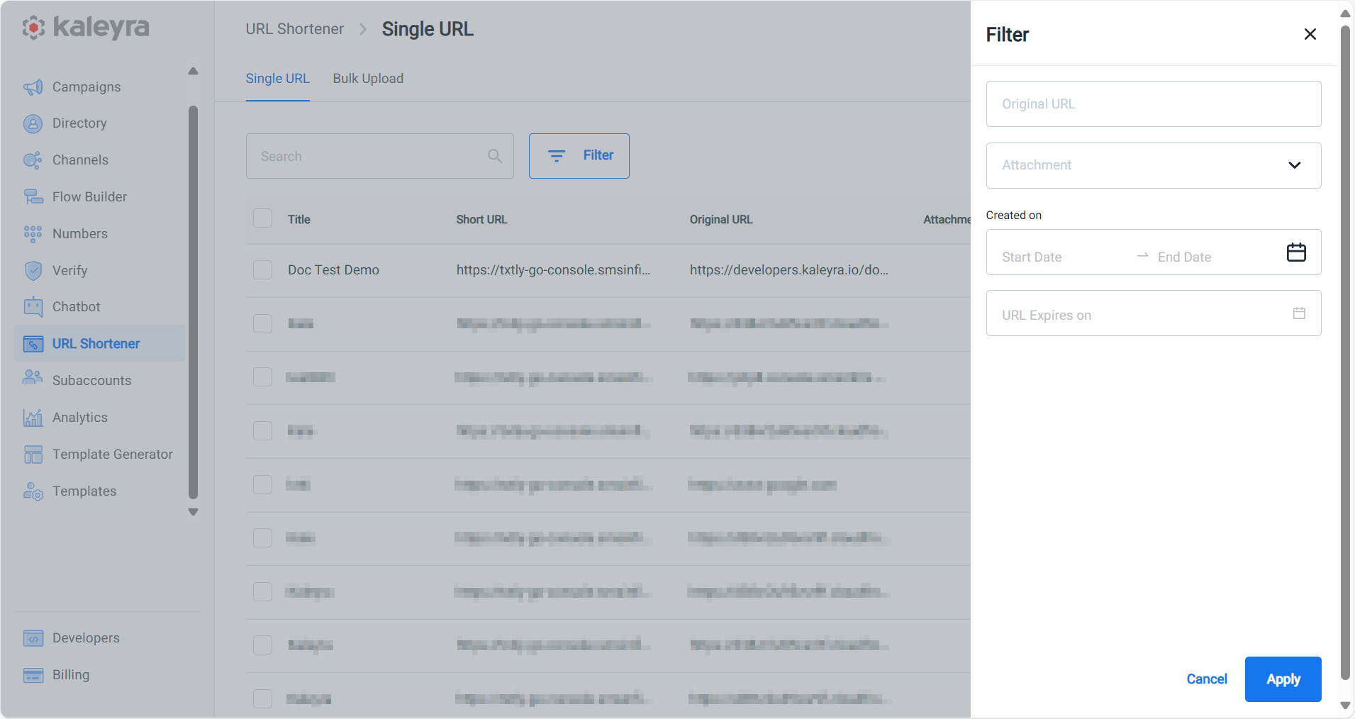 You can filter the shortened URLs based on a creation date range. You need to provide the date range from and to date. Based on the provided date range, the shortened URLs created in that range are displayed.