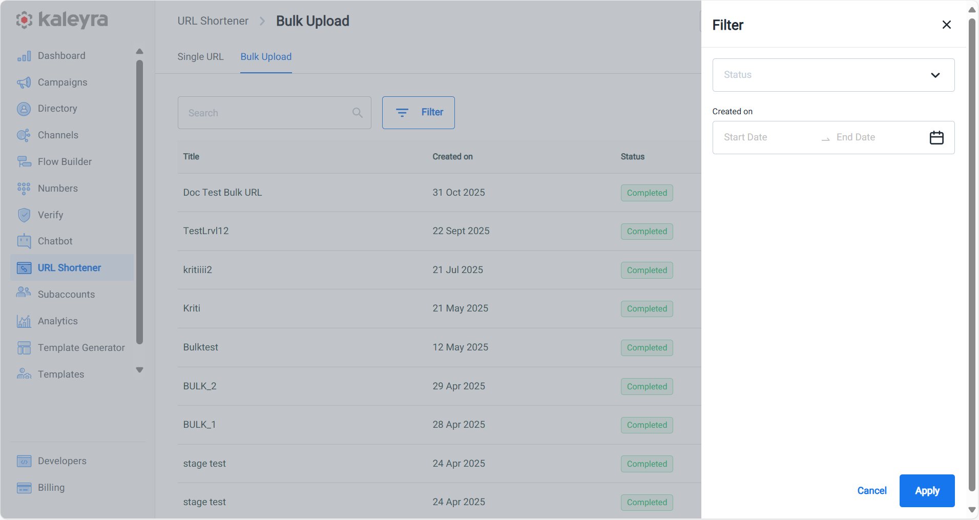 - Status - You can filter based on the status of the files containing bulk URLs, such as completed, pending, processing, and failed.