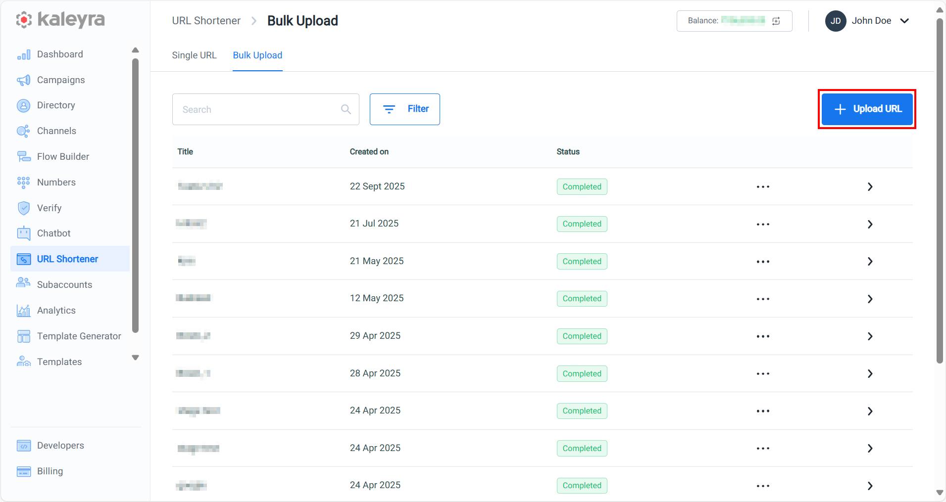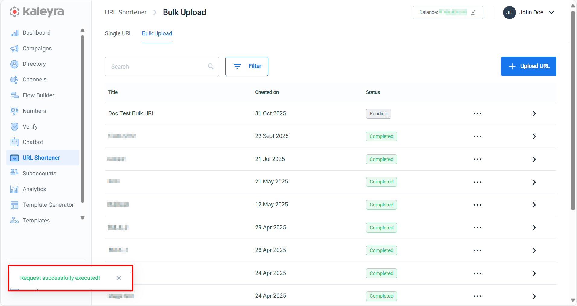 Note:The bulk URLs file will be in pending status. After approval by Kaleyra it will change to completed status, and you will be notified through email registered to your Kaleyra account.