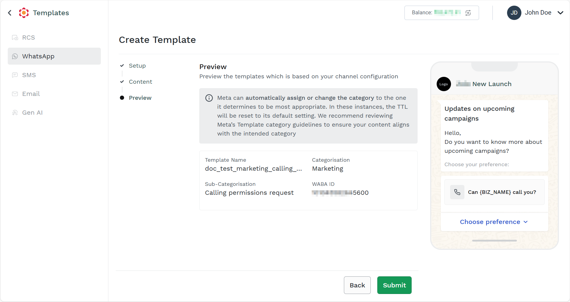 - Preview the WhatsApp template details and click Submit. The order status for marketing template gets created successfully.