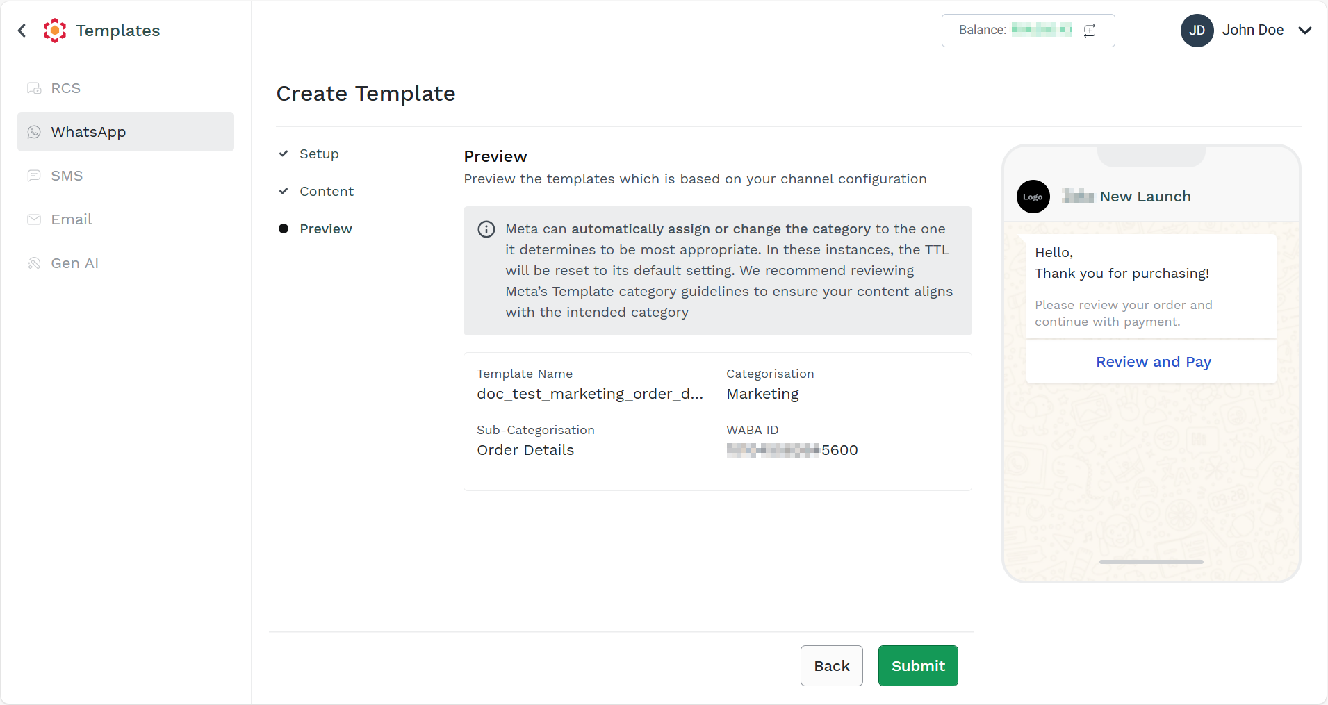 - Preview the WhatsApp template details and click Submit. The order details for the marketing template get created successfully.