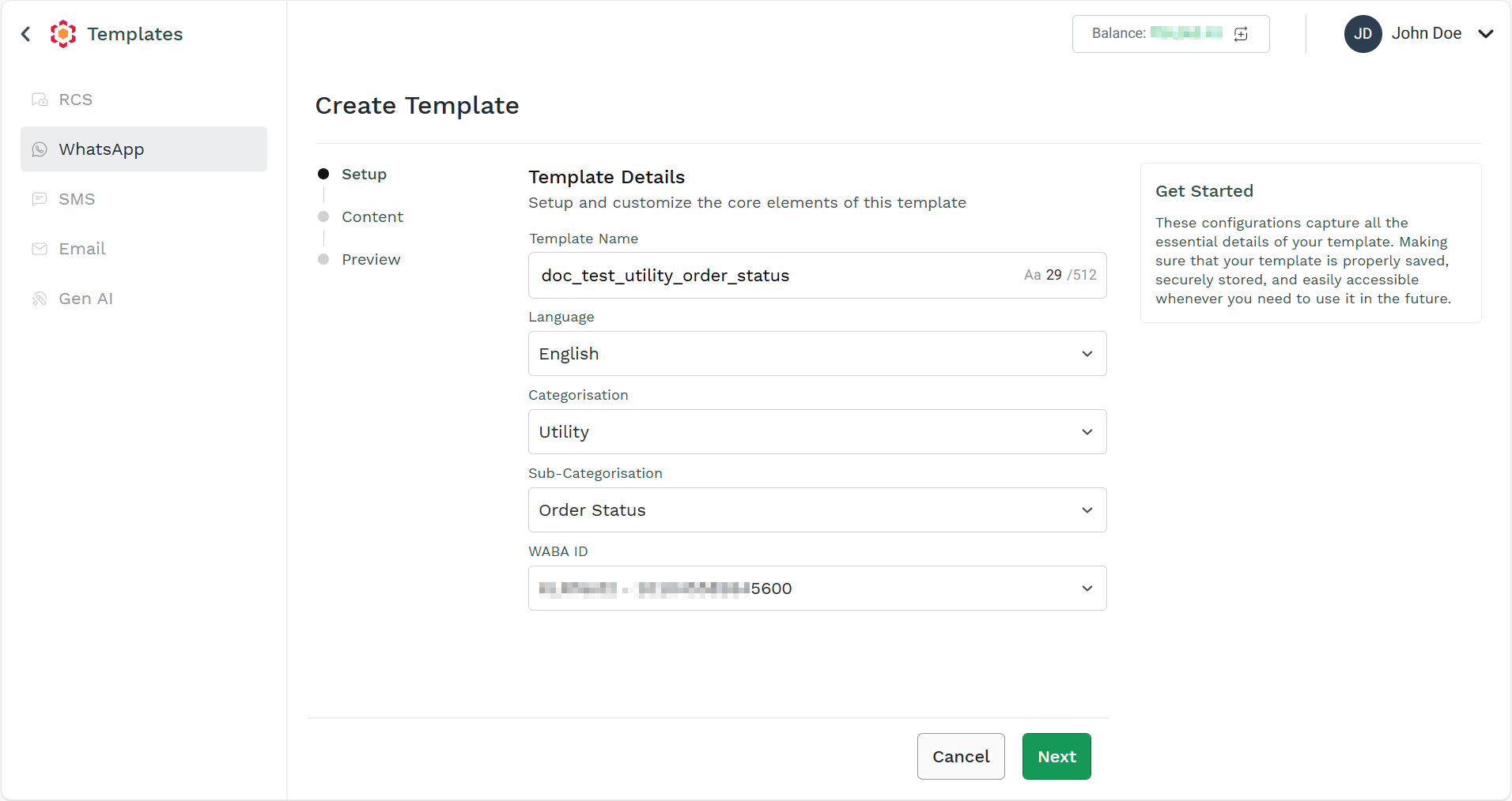 - Follow the steps 1 to step 3 of Create WhatsApp V2 Utility Template.