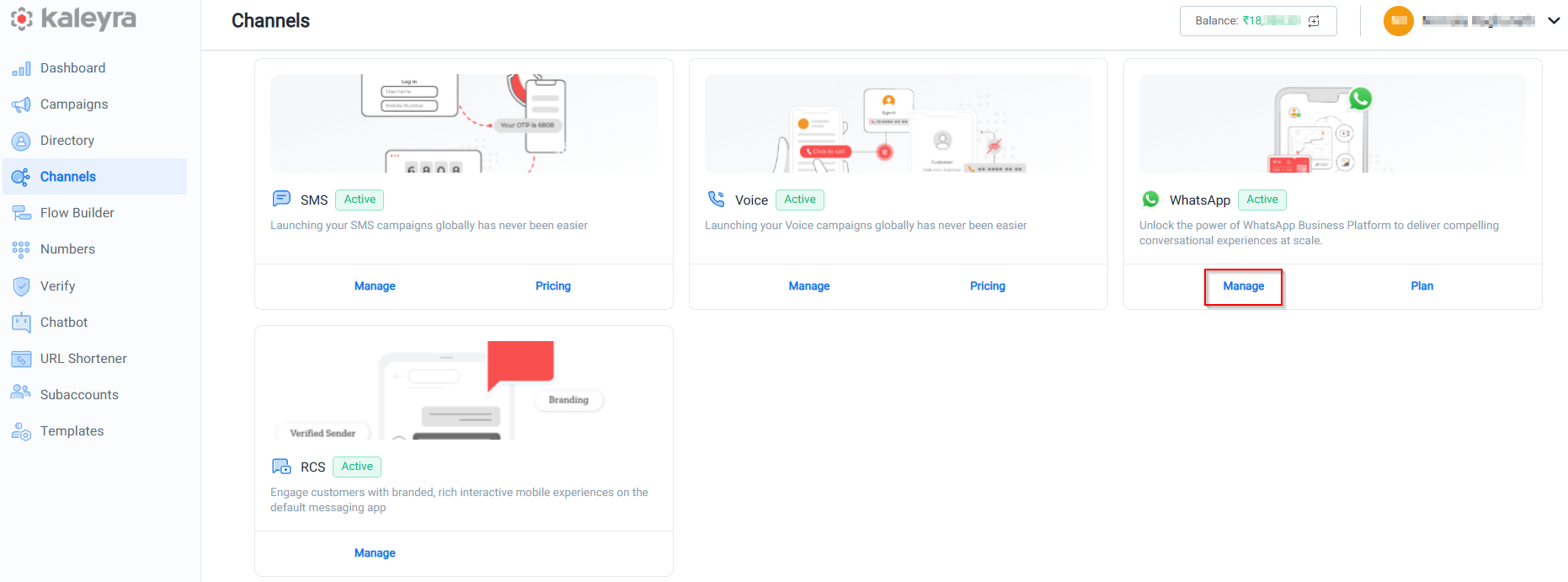 - Sign in to your kaleyra account. The Channels page appears.