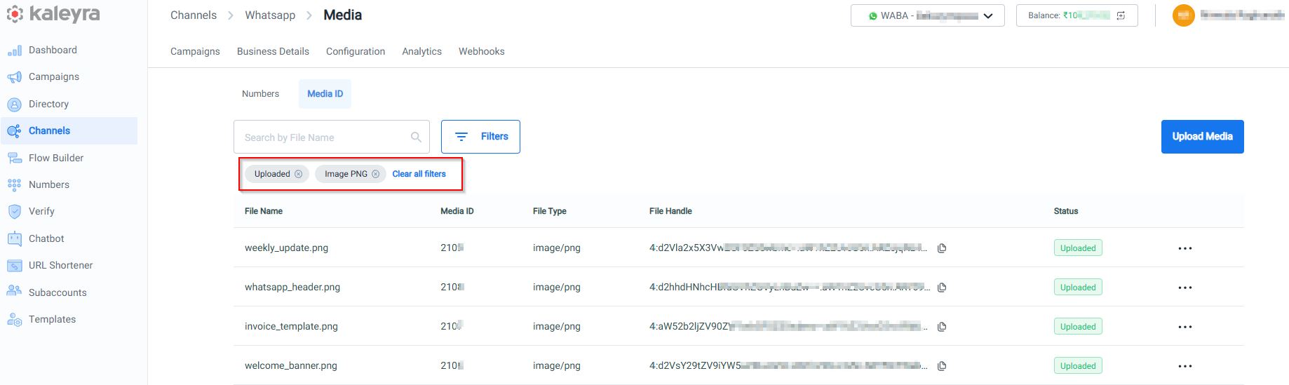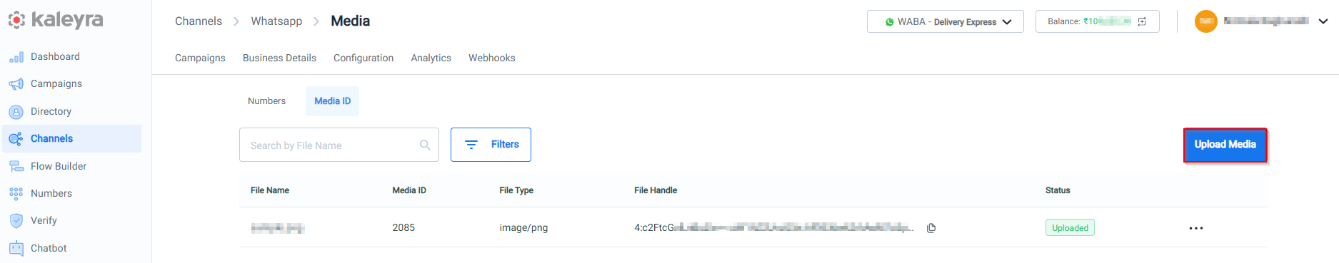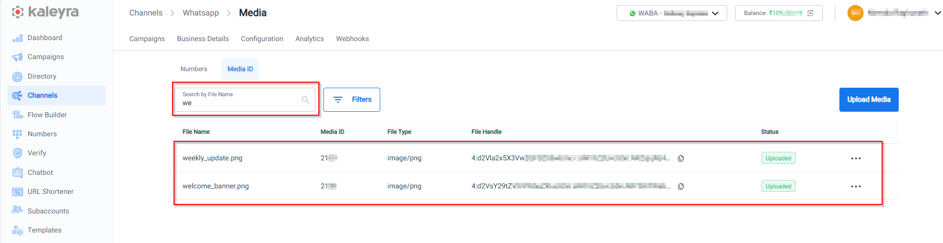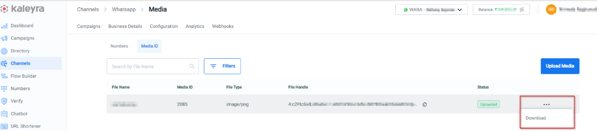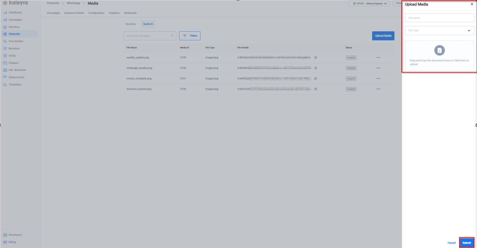 - The Upload Media feature is available only for WhatsApp Business Accounts (WABA) belonging to Kaleyra WhatsApp API V2.