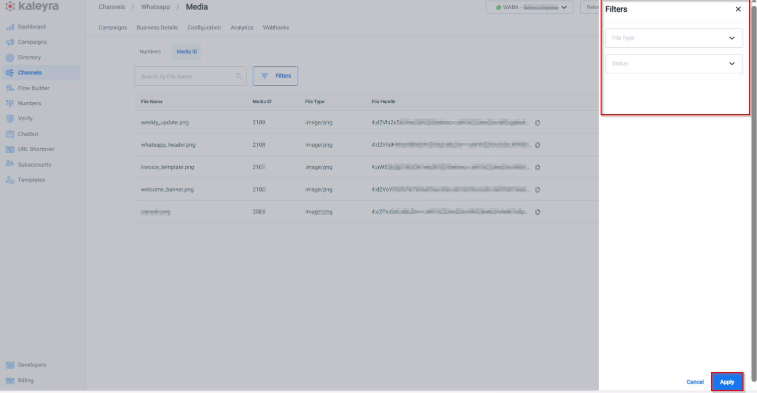 The Upload Media feature allows you to upload and manage media assets such as images, documents, and videos. These assets can later be used in templates associated to a WABA belonging to Kaleyra WhatApp API V2, particularly for Utility and Marketing template categories. It supports resumable media uploads, improving reliability during media upload and management.