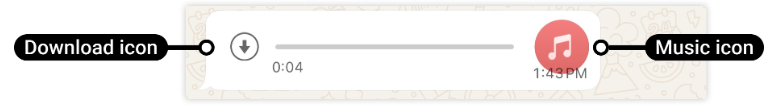 Basic audio messages display a download icon and a music icon. When the business taps the play icon, the business must manually download the audio message for the WhatsApp client to load and then play the audio file.